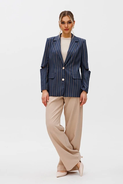Костюм состоит из жакета, майки и брюк. Жакет полуприлегающего силуэта из костюмной ткани с воротником пиджачного типа. Застежка однобортная на две петли и пуговицы По переду талиевая вытачка и рельеф. В районе талии настрочной клапан. Спинка со средним швом и рельефом. Рукав втачной двухшовный с прорезью в районе локтя. Жакет частично на подкладке. Майка из трикотажной ткани прилегающая. Горловина, окаты рукавов обработаны широкими планками. Брюки расширенные книзу с притачным поясом. По передней и задней частям брюк вытачки. Длина жакета - 70 см. , длина рукава - 60 см. Длина брюк по боковому шву без учета пояса- 108 см. Длина майки -55 см. Майка: хлопок 97%, эластан 3 % Брюки: ПЭ 62%, вискоза 32%, спандекс 6%.
