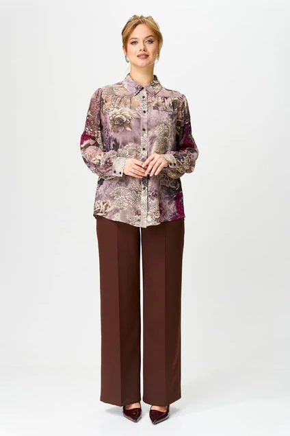Костюм состоит из блузки и брюк. Блузка прямого силуэта из блузочной ткани. Перед с центральной застежкой на притачной планке. Перед и спинка с кокетками. В нижней части переда и спинки блузки по линии стачивания с кокеткой сборка. Воротник на стойке. По задней части стойки настрочена шлевка, в которую вставляется сьемный бант. Рукав втачной одношовный по низу со сборкой по линии притачивания к манжете и со сборкой по окату. Манжета застегивается на 2 петли и пуговицы. Брюки расширеные книзу с притачным поясом. спереди застежка гульфик на молнии и петлей и пуговицей по поясу. По задней частям брюк вытачки. Пояс срезинкой в боковых частях.