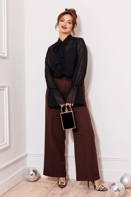 Блузка свободного силуэта выполнена из шифона. Перед с нагрудной вытачкой. Застежка центральная с отрезной планкой на петли и пуговицы. Воротник со стойкой. В правой части переда в планку вставлена рюша. Рукав втачной одношовный со сборкой на резинку в нижней части с образованием волана. В боковых швах разрезы. Пуговица на стойке декоративная. К блузке прилагается топ из того же шифона на регулируемых бретльках. Брюки расширеные книзу с притачным поясом. Спереди застежка гульфик на молнии и петлей и пуговицей по поясу. По задней частям брюк вытачки. Пояс срезинкой в боковых частях. Брюки с заутюженными стрелками. Длина блузки - 68 см, длин рукава блузки - 64 см, длина топа - 38 см, длина брюк с учетом пояса -109 см.