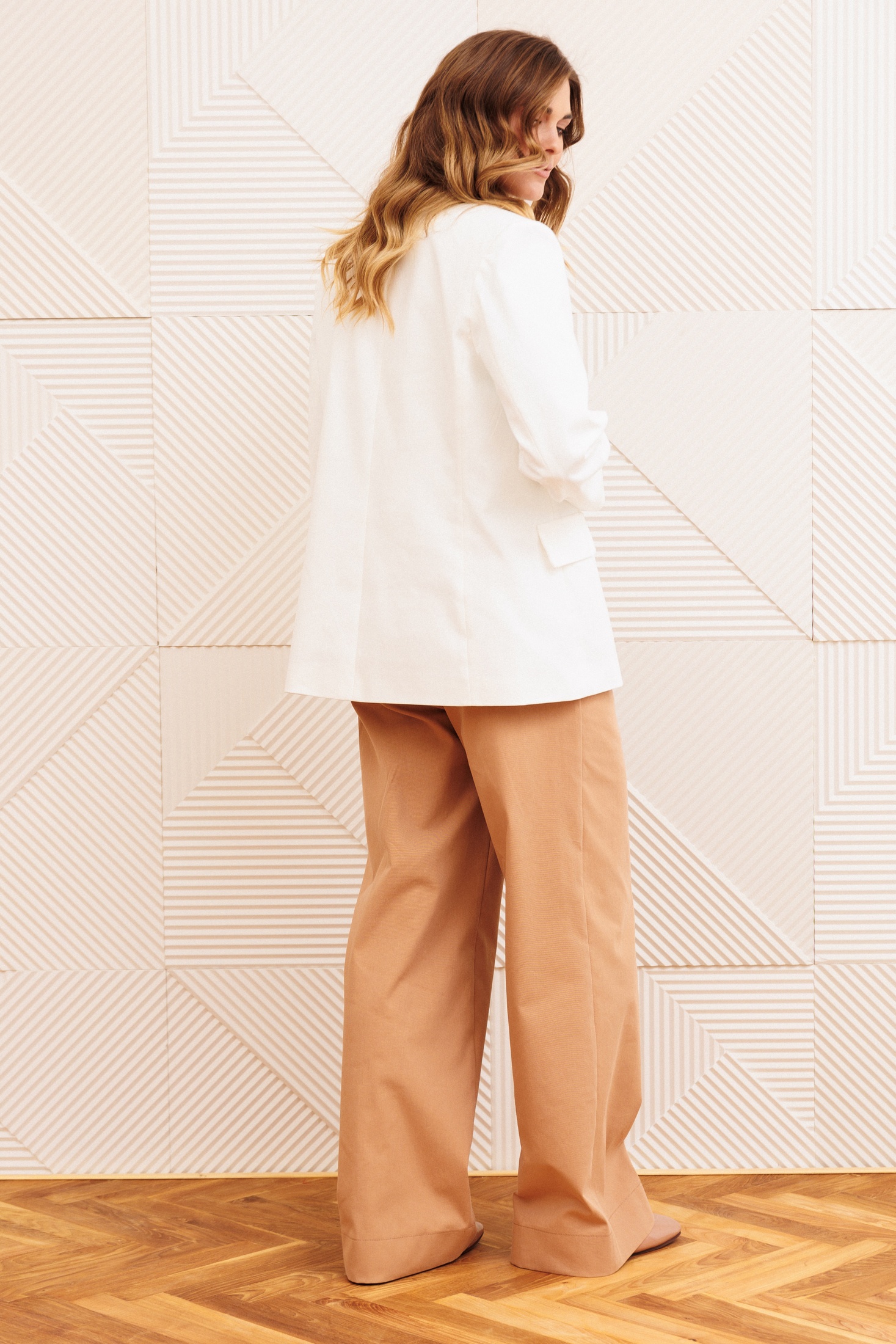 Костюм брючный 5377 молочный + мокко мусс GIZART — это стильное сочетание классического жакета и брюк из джинсовой хлопковой ткани. Коллекция бренда GIZART отличается продуманным дизайном, где каждую деталь подчеркивает однобортная застежка на две пуговицы и декоративный клапан. Жакет полуприлегающего силуэта с воротником пиджачного типа дополняет стильный втачной двухшовный рукав длиной 60 см. Брюки расширенные книзу, с притачным поясом и шлевками, оформлены карманами и отделочной строчкой. Длина жакета составляет 68 см, а брюки с учетом пояса — 107 см. Молочный цвет верхней части и оттенок мокко брюк создают гармоничную палитру, подходящую для офисного и повседневного стиля. Этот костюм прекрасно подойдет для весенне-летнего сезона, придавая вашему образу свежесть и современность.