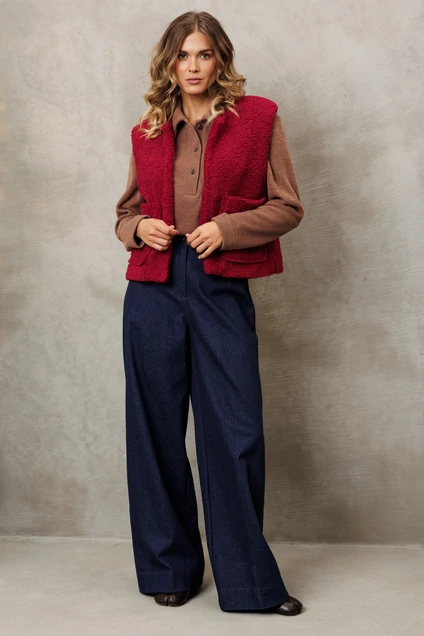 Жилет прямого свободного силуэта из теплой ткани "барашек". Перед с настрочными карманами. Застежка на 3 петли и пуговицы. Жилет на подкладке. Брюки расширеные книзу на притачном поясе из джинсовой хлопковой ткани. По поясу настрочены шлевки. По передним и задним частям брюк вытачки. На задних частях брюк настрочены карманы. Карманы, вытачки, пояс, низ брюк отделаны отделочной строчкой. Длина жилета - 52 см. Длина брюк с учетом пояса - 109 см