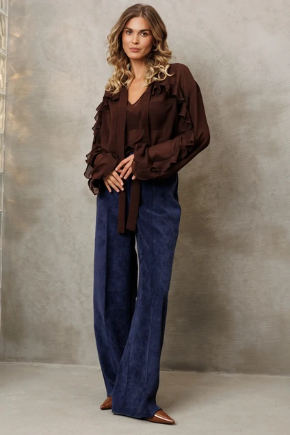 Костюм состоит из блузки и брюк. Блузка свободного силуэта из струящейся шифоновой ткани. Перед и спинка с кокеткой и сборкой. Рукав спущенный свободный с резинкой понизу. Вдоль линии кокетки и рукава вставлена рюша. Горловина V-образной формы с воротником стойкой переходящей в бант. Брюки палаццо с притачным поясом из мягкой вельветовой ткани. Спереди застежка гульфик на молнии и петлей и пуговицей по поясу. По задней частям брюк вытачки. Пояс с резинкой в боковых частях. Брюки с заутюженными стрелками. Длина блузки - 67см, длина рукава - 60 см. Длина брюк с учетом пояса - 109 см.