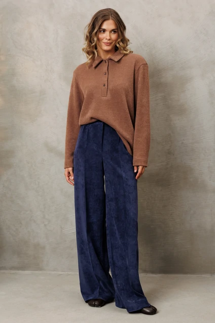 Костюм состоит из джемпера и брюк. Джемпер прямого силуэта с воротником поло из теплого трикотажного полотна. Рукав втачной одношовный. Брюки палаццо с притачным поясом из мягкой вельветовой ткани. Спереди застежка гульфик на молнии и петлей и пуговицей по поясу. По задней частям брюк вытачки. Пояс с резинкой в боковых частях. Брюки с заутюженными стрелками. Длина джемпера- 66 см, длина рукава - 60 см. Длина брюк с учетом пояса - 109 см.