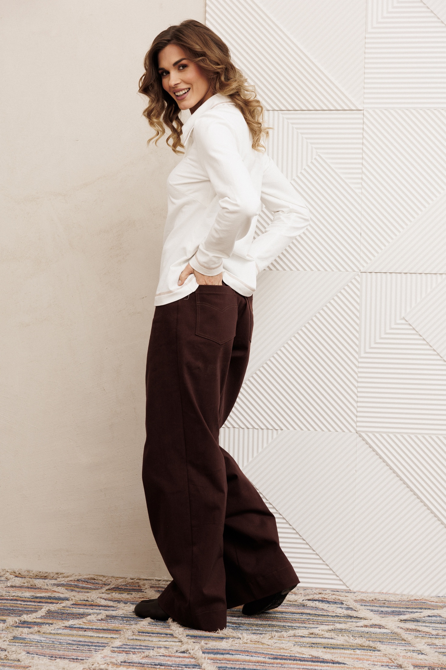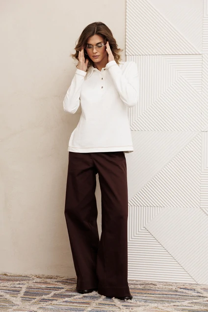 Костюм брючный 5415 молочный + шоколадный джинс GIZART идеально подходит для стильного повседневного выхода. Коллекция бренда GIZART предлагает этот костюм, сочетающий функциональность и трендовый дизайн. Джемпер из трикотажного полотна с поло-застежкой и аккуратными нагрудными вытачками обеспечивает комфорт и стильное облегание. Декоративная строчка по воротнику и низу придаёт изделию элегантную завершенность. Брюки из хлопковой джинсовой ткани расширены книзу и имеют удобный притачной пояс с шлевками. Шоколадный оттенок брюк гармонично сочетается с молочным цветом джемпера, создавая классический и изысканный образ. Этот ансамбль подходит для весенне-осеннего сезона и станет идеальным выбором для деловых встреч или непринужденных прогулок.