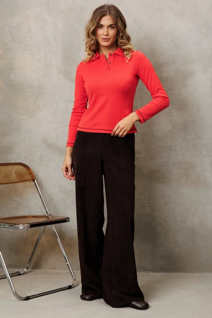 Костюм состоит из джемпера и брюк. Джемпер приталенного силуэта с воротником поло из трикотажного полотна. Рукав втачной одношовный. Брюки палаццо с притачным поясом из мягкой вельветовой ткани. Спереди застежка гульфик на молнии и петлей и пуговицей по поясу. По задней частям брюк вытачки. Пояс с резинкой в боковых частях. Брюки с заутюженными стрелками. Длина брюк с учетом пояса - 109 см. Длина джемпера - 57 см, длина рукава - 60 см.
