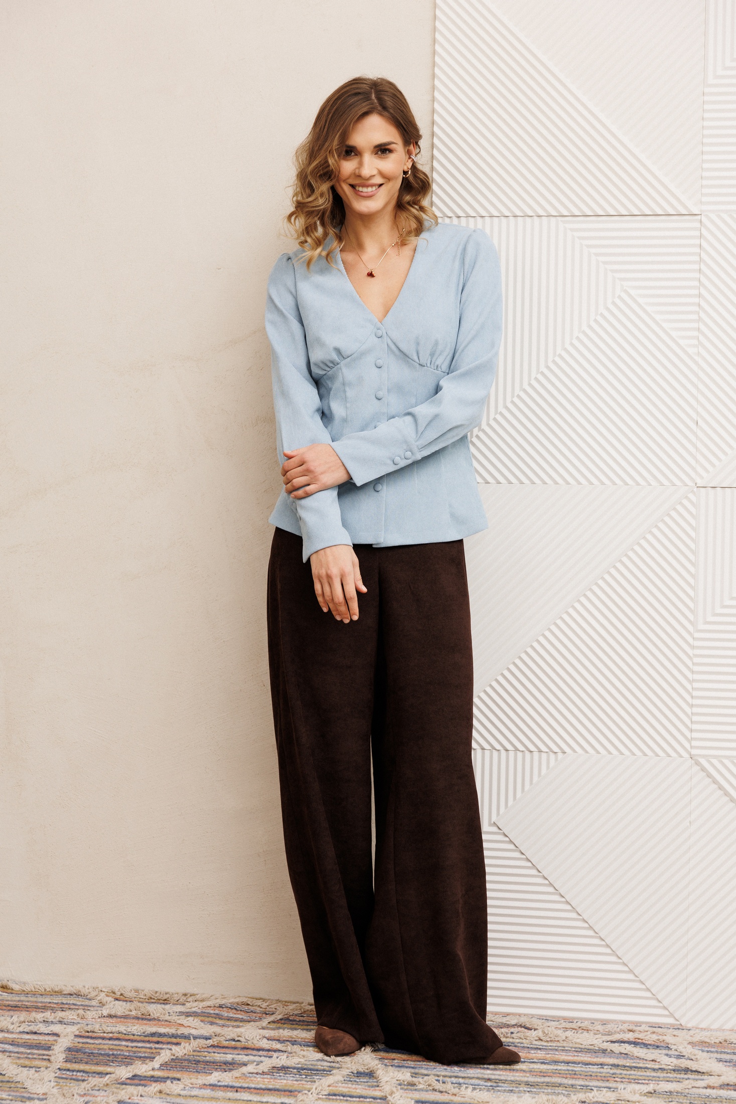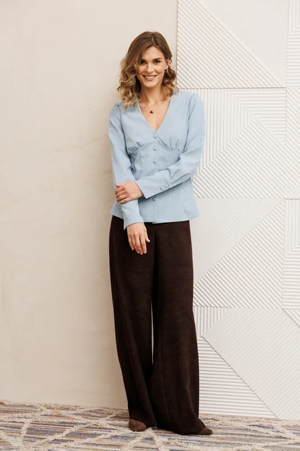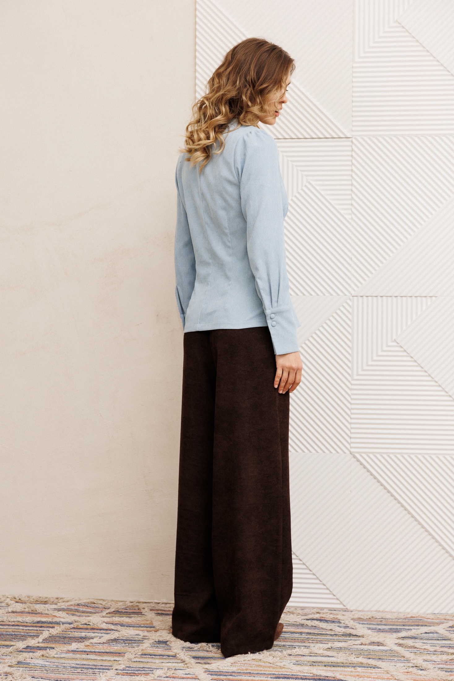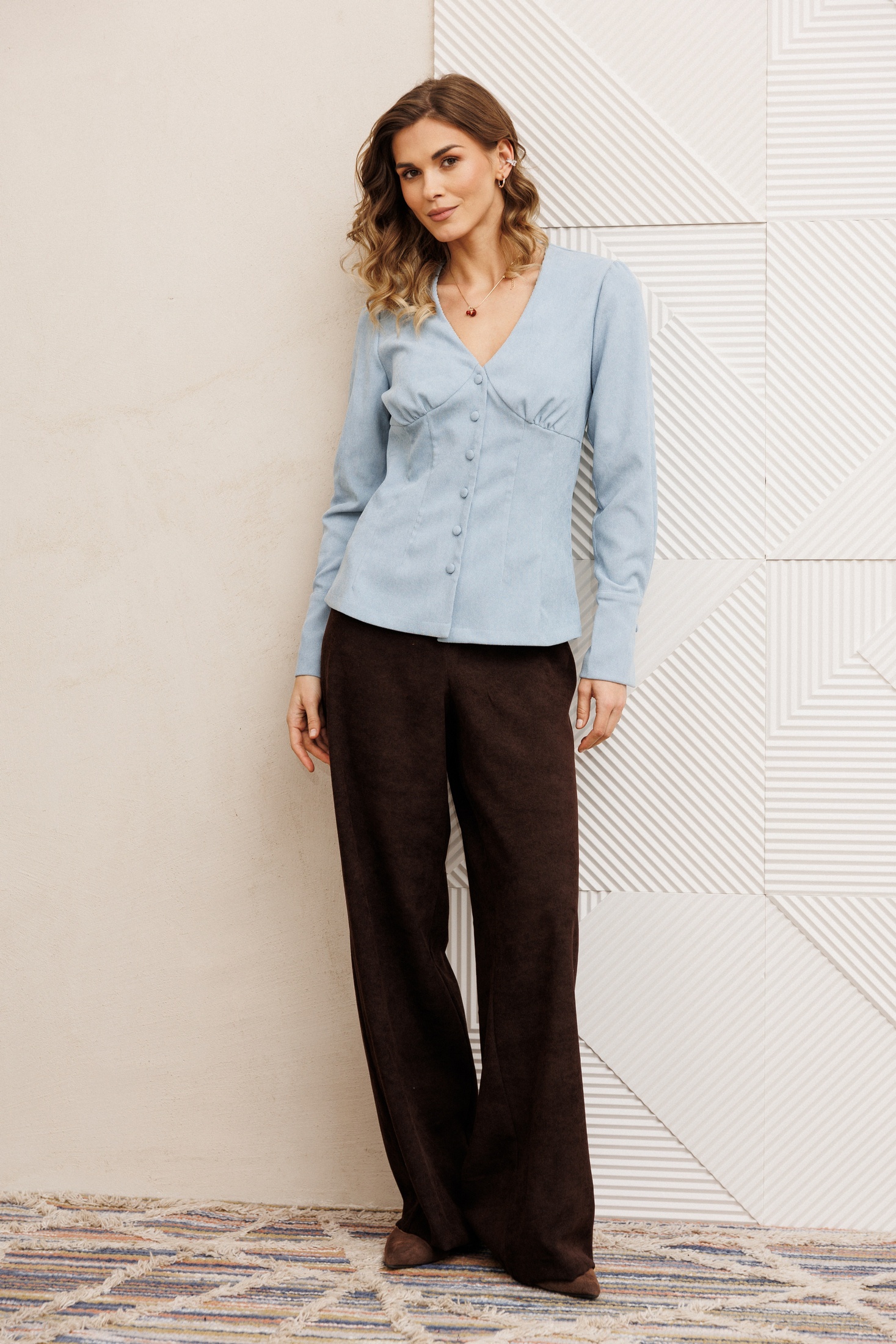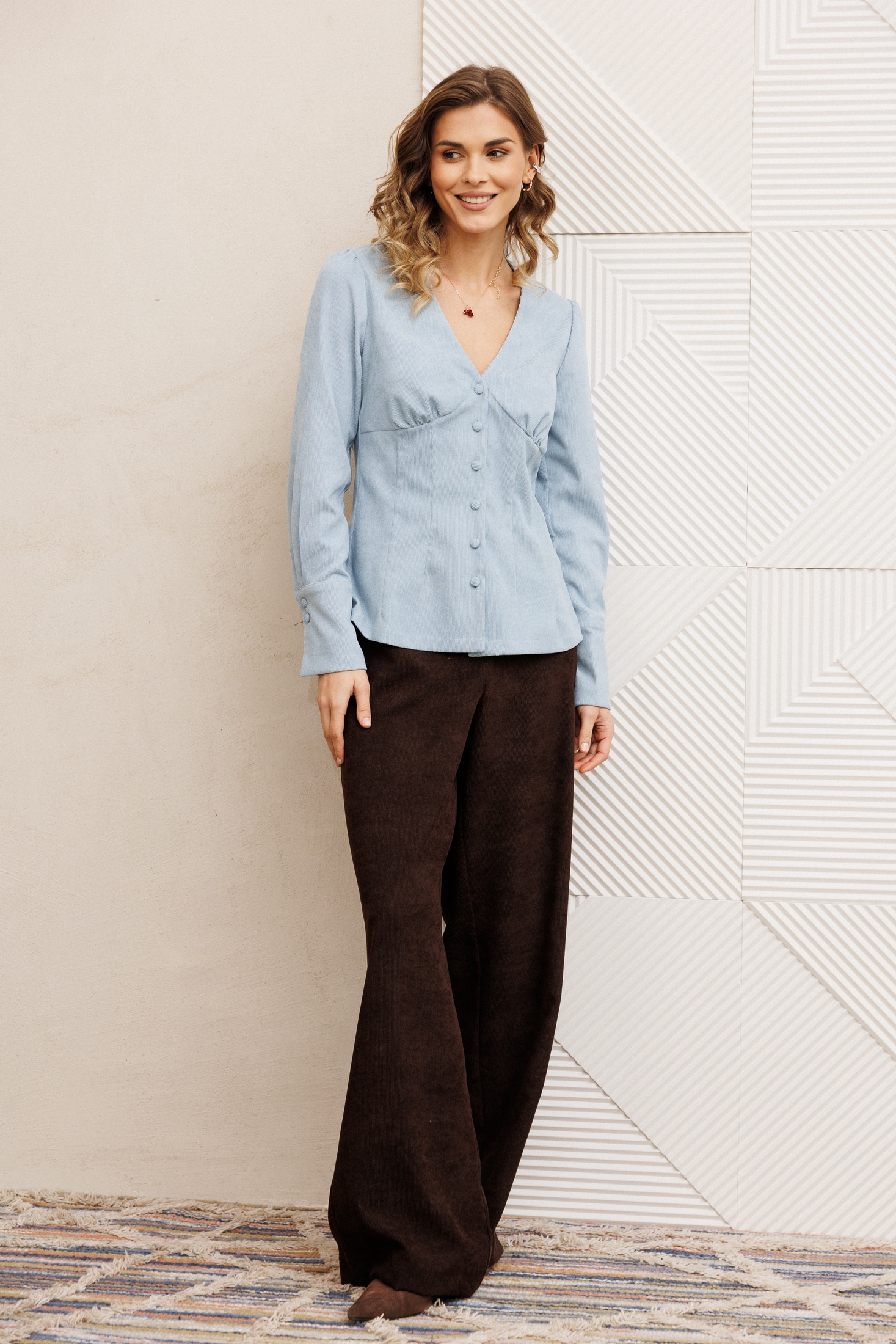 Костюм брючный 5421 шоколадно-голубой GIZART — это утонченный выбор для женского гардероба. Коллекция бренда GIZART предлагает уникальное сочетание стиля и комфорта. Костюм выполнен из мягкого вельвета, обеспечивая приятное ощущение на коже. Шоколадно-голубой оттенок подходит для повседневного и офисного стиля любого сезона. Блузка с приталенным силуэтом и оригинальной V-образной горловиной дополняется манжетами и пуговицами для утонченного образа. Брюки палаццо с заутюженными стрелками и резинкой на поясе гарантируют удобство движения. Это идеальный вариант для тех, кто ищет универсальный и стильный наряд.