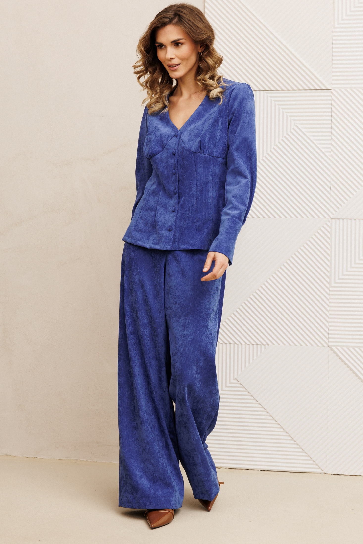 Костюм брючный 5421 ярко синий GIZART привлекает внимание своим уникальным стилем и ярким цветом. Коллекция бренда GIZART создана для современной женщины, ценящей стиль и комфорт. Изготовленный из мягкого вельвета, костюм включает приталенную блузку и брюки-палаццо. V-образный вырез и изящная застежка на петли и пуговицы придают комплекту женственность и изящность. Высокие манжеты с пуговицами добавляют нотку оригинальности. Брюки с заутюженными стрелками и притачным поясом удобны и элегантны. Ярко-синий цвет делает костюм идеальным выбором для офисных встреч и вечерних мероприятий в любое время года.