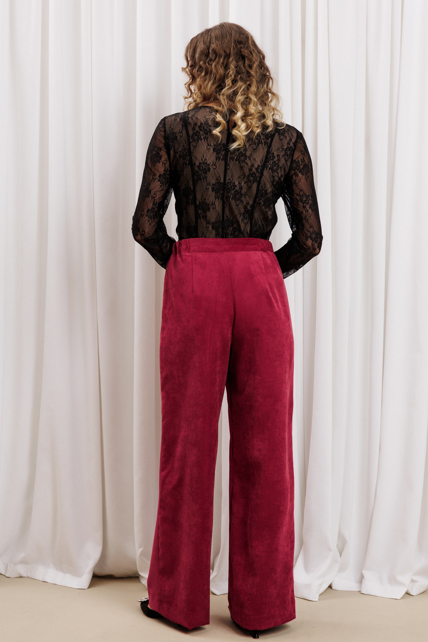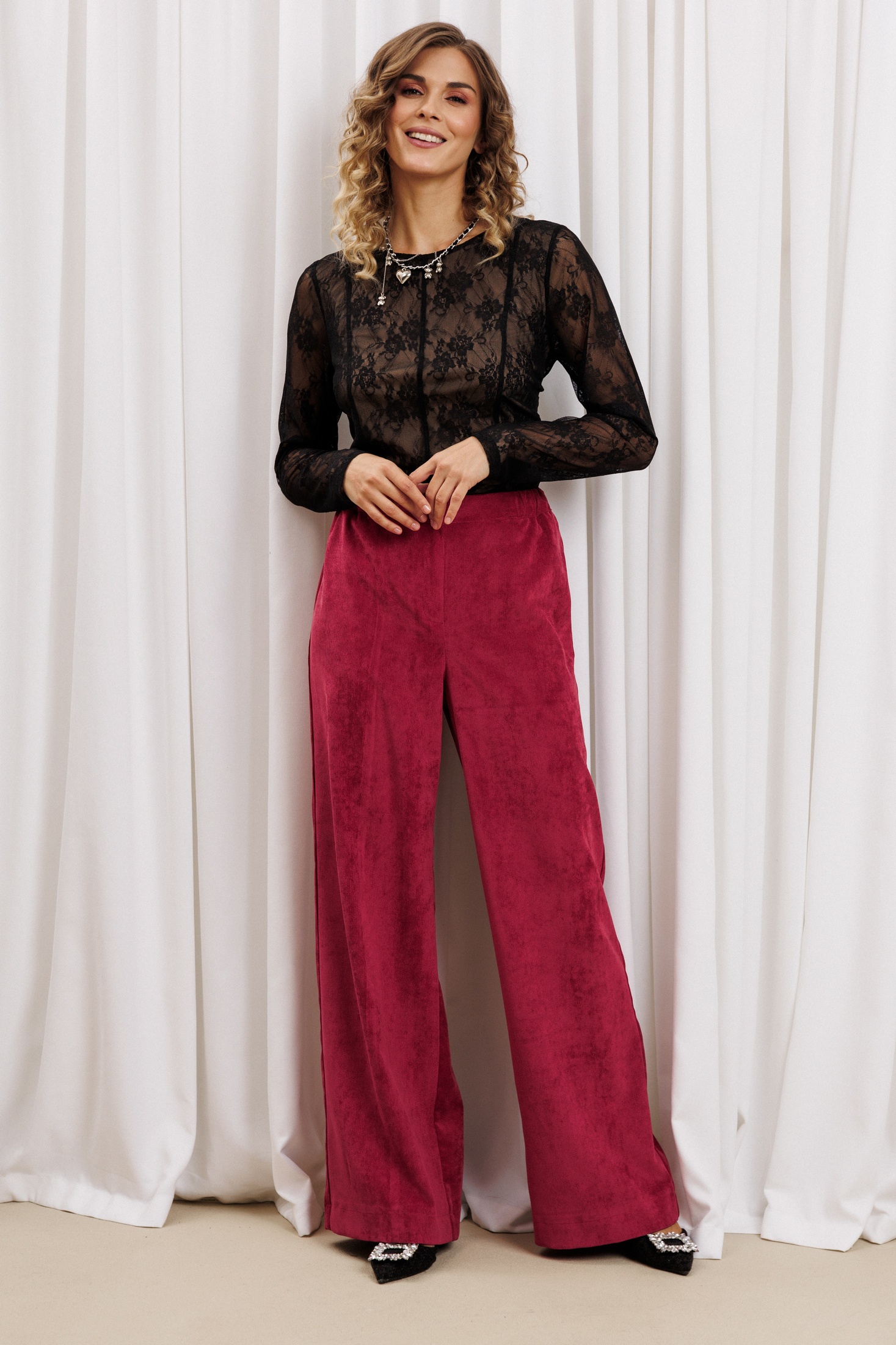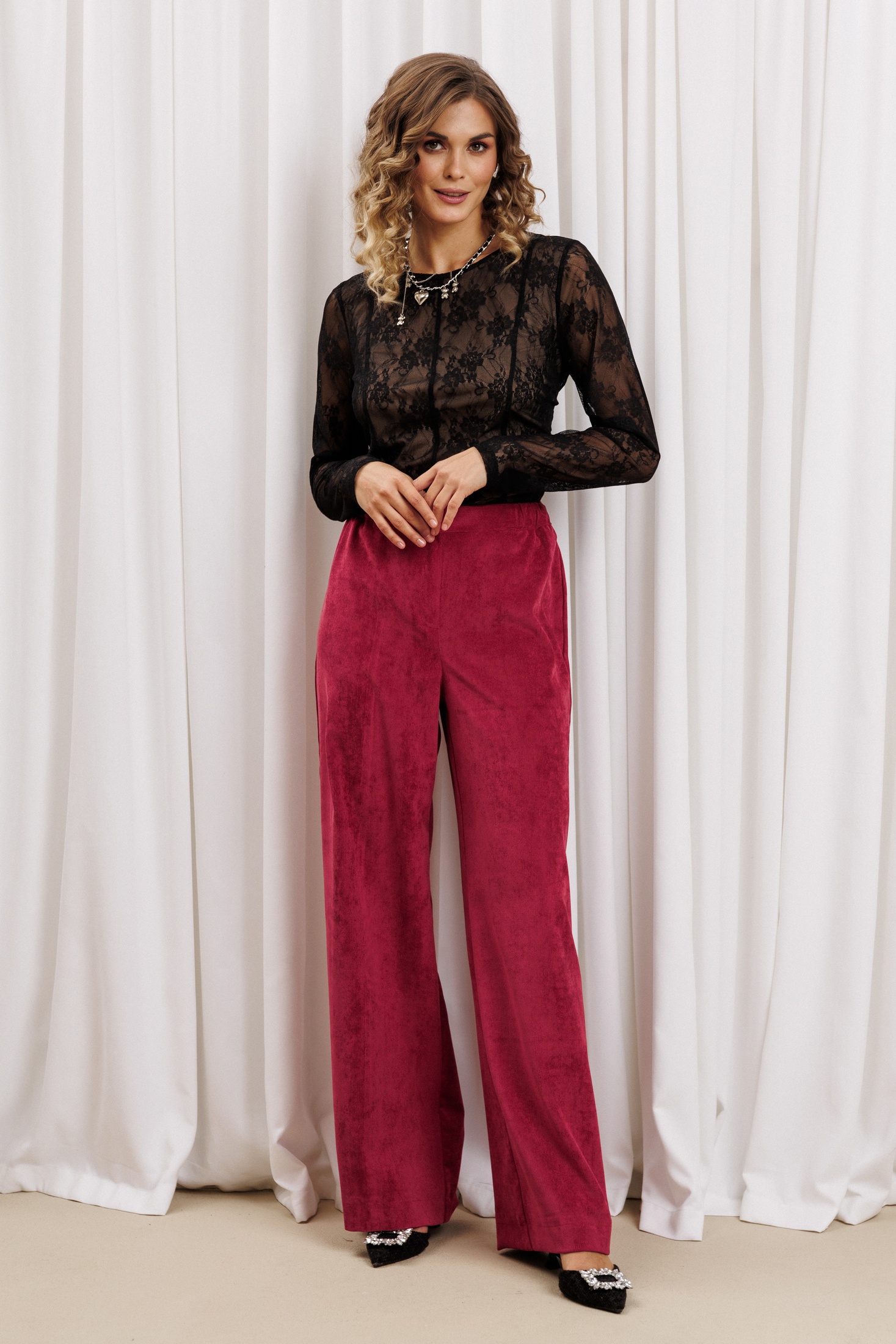 Костюм состоит из блузки и брюк. Блузка приталенного силуэта из кружевной сетки. Перед и спинка с рельефами и средним швом. Рукав втачной. Перед и спинка на телесной подкладке. Длина джемпера - см, длина рукава джемпера - см. Брюки палаццо с притачным поясом из мягкой вельветовой ткани. Спереди застежка гульфик на молнии и петлей и пуговицей по поясу. По задней частям брюк вытачки. Пояс с резинкой в боковых частях. Брюки с заутюженными стрелками. Длина брюк с учетом пояса - 109 см. Изделие подходит на рост 164-170