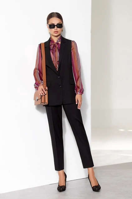Комплект состоящий из жилета, блузки и брюк. Жилет прямого силуэта однобортный с застежкой на две петли и пуговицы, воротником пиджачного типа с узким лацканом. Перед с талиевыми вытачками, клапанами. Спинка со редним швом. Жилет на подкладке. Блузка прямого силуэта с V-образным вырезом горловины. мягкой стойкой переходящей в бант. Перед с нагрудными вытачками. Рукав собран на манжету на эластичной тесьме. Брюки зауженые книзу с отрезным поясом со шлевками, со складками по переду слегка застроченными сверху. В задних половинках брюк вытачки. В боковых швах наклонные карманы. Застежка на молнию с гульфиком и одну пуговицу по центру. Длина жилета - 73 см, длина блузки - 67 см, длина рукава блузки - 60 см, длина брюк - 92 см.