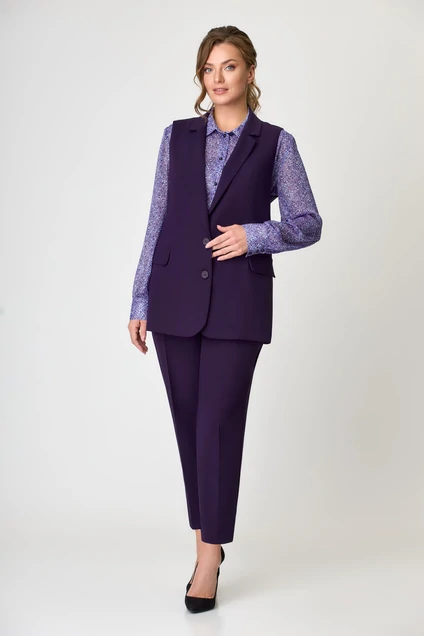 Костюм состоящий из жилета, блузки и брюк. Жилет прямого силуэта с однобортной с застежкой на две петли и пуговицы.  Перед с талиевыми вытачками и декоративными клапанами. Спинка со средним швом. Воротник пиджачного типа. Жилет на подкладке. Блузка прямого силуэта застегивается на центральную планку на 6 петель и пуговиц. Перед со сборкой по шву притачивания кокетки . Воротник стояче-отложной с отрезной стойкой  на 1 пуговицу и петлю. Рукав втачной одношовный со сборкой по шву притачивания манжеты. Манжета застегивается на три петли и пуговицы.  Классические брюки зауженные к низу. В боковых швах обработаны карманы с наклонным входом. По передним частям брюк частично застрочены складки. Застежка  на молнию. Верх брюк обработан поясом-обтачкой со шлевками, с застежкой на две петли и пуговицы. Задние части брюк с вытачками в области талии. По передним и задним частям брюк заутюжены стрелки. Фурнитура может быть изменена с сохранением художественного замысла. Длина жилета по спинке- 73 см, длина по спинке блузки - 64 см, длина рукава блузки - 62 см, длина брюк с учетом пояса - 93см.