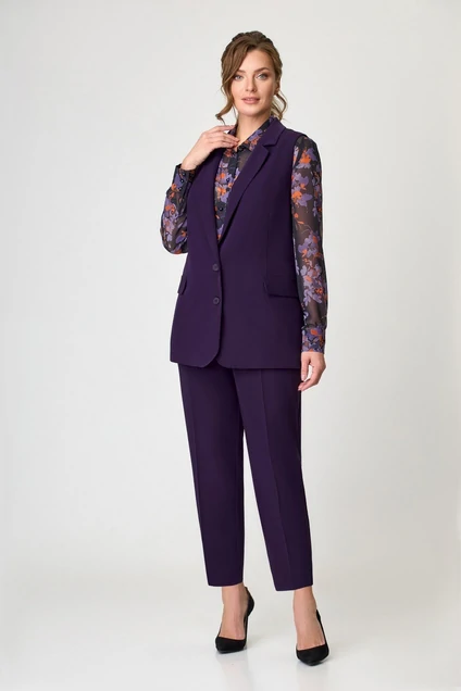 Костюм состоящий из жилета, блузки и брюк. Жилет прямого силуэта с однобортной с застежкой на две петли и пуговицы. Перед с талиевыми вытачками и декоративными клапанами. Спинка со средним швом. Воротник пиджачного типа. Жилет на подкладке. Блузка прямого силуэта застегивается на центральную планку на 6 петель и пуговиц. Перед со сборкой по шву притачивания кокетки . Воротник стояче-отложной с отрезной стойкой на 1 пуговицу и петлю. Рукав втачной одношовный со сборкой по шву притачивания манжеты. Манжета застегивается на три петли и пуговицы. Классические брюки зауженные к низу. В боковых швах обработаны карманы с наклонным входом. По передним частям брюк частично застрочены складки. Застежка на молнию. Верх брюк обработан поясом-обтачкой со шлевками, с застежкой на две петли и пуговицы. Задние части брюк с вытачками в области талии. По передним и задним частям брюк заутюжены стрелки. Фурнитура может быть изменена с сохранением художественного замысла. Длина жилета по спинке- 73 см, длина по спинке блузки - 64 см, длина рукава блузки - 62 см, длина брюк с учетом пояса - 93см. Блузка – полиэстер 100%