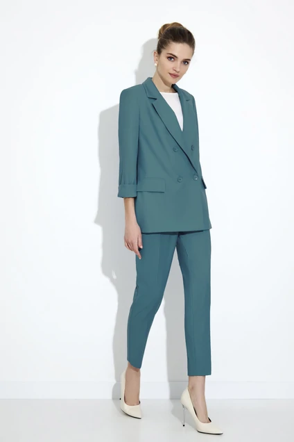 Комплект, состоящий из жакета, блузки и брюк. Жакет прямого силуэта с двубортной застёжкой и пиджачным воротником, на подкладке. По переду настрочены клапаны. Спинка со средним швом. Рукав втачной двухшовный с отложной манжетой. Блузка прямого силуэта с нагрудными вытачками. Линия низа фигурная, в боковых швах разрезики. В области горловины разрез и застёжка на навесную петлю и пуговицу. Рукав втачной одношовный. Брюки зауженные к низу, с заутюженными стрелками, односторонними складками в области талии, застёжкой на молнию спереди и функциональными карманами. Верх брюк обработан широким притачным поясом со шлёвками. Фурнитура изделия может быть изменена в зависимости от её наличия на складе. Длина жакета-71 см, длина рукава-50 см, длина блузки-64 см, длина рукава-18 см, длина брюк-94 см Блузка :Полиэстер 100%