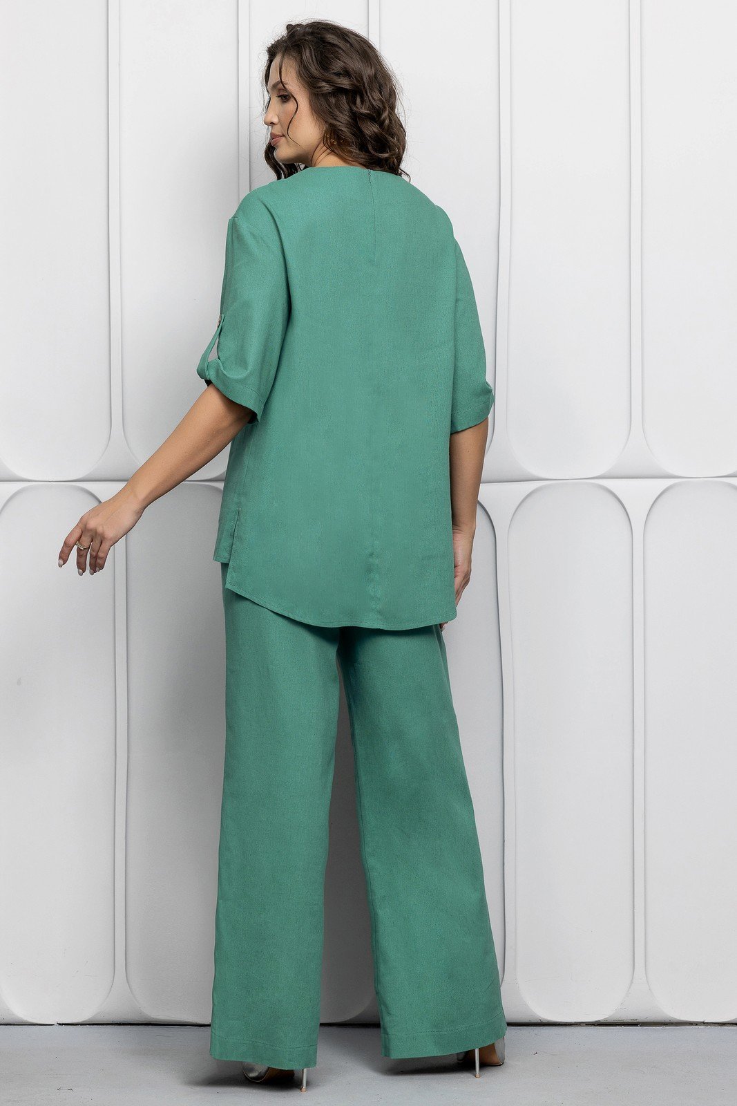 Льняной брючный костюм с широкими прямыми брюками по типу «палаццо» и льняной рубашкой оверсайз от белорусского бренда ГолдСтайл – ТРЕНД 2024-2025 года и просто находка для женщин и девушек «plus size». Этот комплект из эко льна 70% с добавлением вискозы 30% отлично подойдет обладательницам пышных форм, которые хотят выглядеть стильно и модно. Одежда из льна прекрасно подходит на сезон весна – лето, дышащий материал очень приятный на ощупь и к телу. Комплект состоит из прямых широких брюк свободного покроя и блузки, вещи из данной капсулы легко сочетать с другими предметами вашего гардероба создавая модные и стильные луки. Блузка с округлым вырезом прямого силуэта свободной формы по типу оверсайз отлично скроет все недостатки фигуры. Перед оформлен нагрудными вытачками, спинка, чуть удлиненная со средним швом и застежкой на потайную молнию в среднем шве. Разрезы по бокам отлично дополняют модель, очень удобно и практично. Линия плеча немного приспущена. Втачной рукав слегка присобран и зафиксирован декоративной патой с пуговицей. Декор в виде пришитых пуговиц на втором рукаве отлично дополняет и завершает весь образ в сочетании с таким же приемом асимметрии на брюках. Трендовые широкие брюки средней посадки с косыми карманами и отрезным поясом на резинке демисезонные одинаково хорошо подойдут на разные типы телосложения, а также скроют все недостатки фигуры. Прямые штаны трубы с практичными и функциональными карманами и хорошей средней посадкой на мягкой резинке в поясе станут фаворитом вашего гардероба. Пояс с резинкой и шнурками легко регулиривать и зафиксировать на талию, что очень удобно и практично. Яркой индивидуальной особенностью брюк является имитация планки по одной стороне с разрезом по низу, планка украшена пришитыми пуговицами. Удобный наряд с широкими брюками подходит как для деловых встреч и офисных будней, домашнего отдыха и праздничных мероприятий, вечерних выходов. Вы сможете создать актуальный и универсальный образ, подчеркивающий вашу неповторимую красоту.