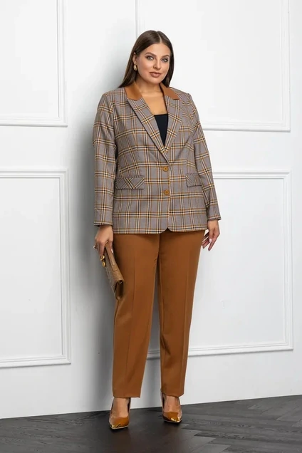 Трендовый брючный костюм в стиле «Dandy» от белорусского бренда ГолдСтайл станет идеальной основой для создания капсульного гардероба женщин и девушек «plus size». Современная интерпретация и новый взгляд на понятие классики, cочетание классической клетки с ярким однотом добавят красок в офисные будни. Пиджак прямого силуэта с отрезными бочками и легким приталиванием отлично подойдет к любому стилю одежды, а также скроет все недостатки. Базовая модель с V-образным вырезом и воротником пиджачного типа на основе классического мужского костюма, застегивается на две пуговицы. Перед оформлен вертикальными вытачками до входа в прорезной карман (карманы функциональные с клапаном и двумя обтачками). Спинка цельная с отрезными бочками. Втачные рукава можно легко подвернуть что добавляет удобства и практичности. Пиджак на подкладке. Зауженные брюки со стрелками и косыми карманами вне трендов и сезонов, они подойдут к любому стилю одежды. Брюки средней посадки с отрезным поясом и косыми карманами слегка заужены к низу. Пояс с резинкой по спинке сзади обеспечивает идеальную посадку на любую фигуру и талию. Отрезной пояс выполнен со шлевками для ремня, что очень удобно и практично. Застежка в поясе обработана по классической итальянской технологии петля-пуговица и гульфик с молнией. Белорусский бренд ГолдСтайл - гарантия отличного качества. Мы с трепетом и любовью относимся к созданию наших моделей для того чтобы они радовали Вас каждый день.