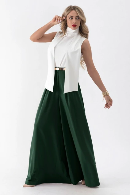 Блузка с воротником- стойкой, переходящей в шарф- завязки по спинке, застежкой на навесную петлю и пуговицу по горловине спинки. Перед с нагрудными вытачками. Спинка со средним швом. Брюки с отрезным поясом, на поясе расположены шлевки. В боковых швах расположены карманы. По передним половинкам, по шву притачивания пояса- встречные складки. Застежка гульфик.