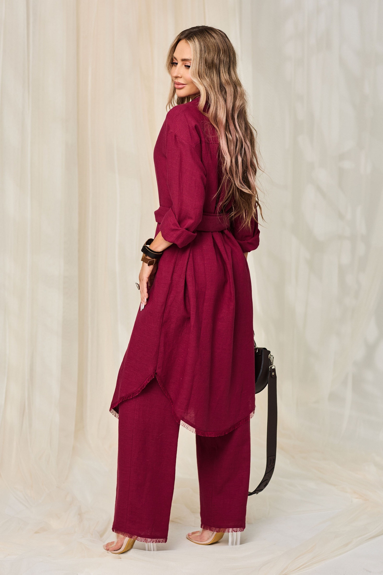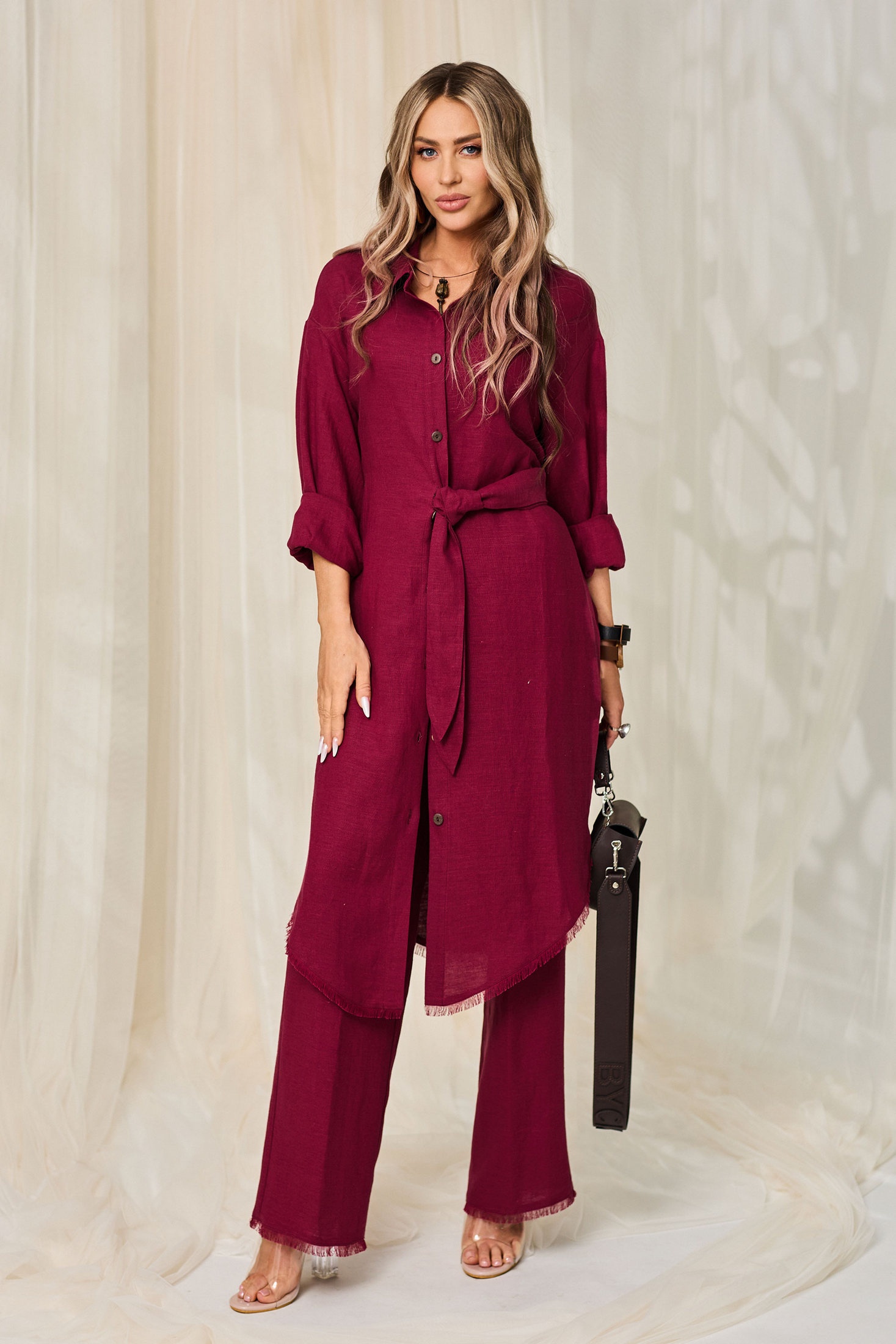 Костюм брючный 6543 бордовый Golden Valley — это утончённое сочетание стиля и комфорта. Коллекция бренда Golden Valley предлагает уникальную тунику с центральной застёжкой на пуговицы и спущенным плечом. Втачной длинный рукав и банты складки на спинке придают образу особенный шарм. Особенности, такие как фигурный низ с бахромой и декоративный пояс, добавляют стильные акценты. Брюки прямого кроя с присобранным на резинку поясом и наклонными карманами обеспечат удобство в повседневной носке. Костюм, выполненный в бордовом цвете, сшит из текстильной ткани, состоящей из 55% льна и 45% вискозы, что делает его идеальным для межсезонья. Этот комплект станет отличным выбором для офисного стиля и деловых встреч.