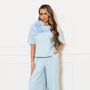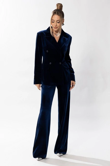 Жакет прямого силуэта с центральной двубортной застежкой на петли и пуговицы, с втачным воротником и отложными лацканами пиджачного типа. По переду с рельефами, выходящими из проймы. На уровне линии талии расположены настрочные клапаны. Спинка со средним швом, рельефами, выходящими из проймы. Рукав втачной, длинный. Брюки прямые, с отрезным поясом. По спинке и частично по переду пояс присборен на резинку.