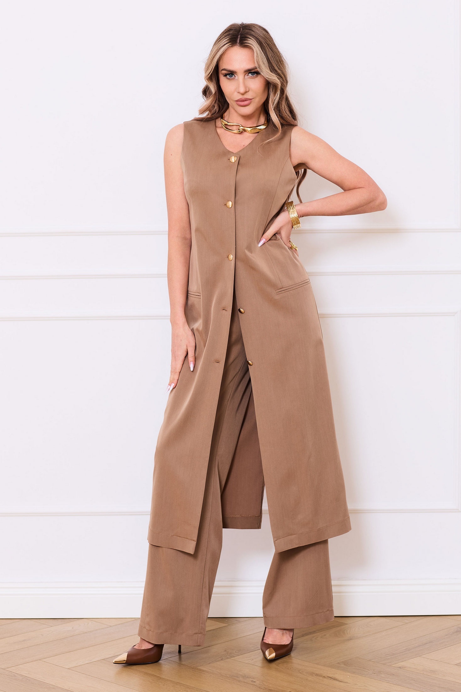 жилет с центральной застежкой на петли и пуговицы, без воротника, с V-образным вырезом горловины. По переду с полурельефами, выходящими из проймы. На уровне линии бедер расположены прорезные карманы в рамку. Спинка со средним швом , заканчивающимся шлицей . Брюки с отрезным поясом. Пояс в области спинки и частично по переду присборен на резинку. По боковым швам расположены карманы. Вход в карман наклонный к боковому шву. Комплект со съемным декоративным поясом.