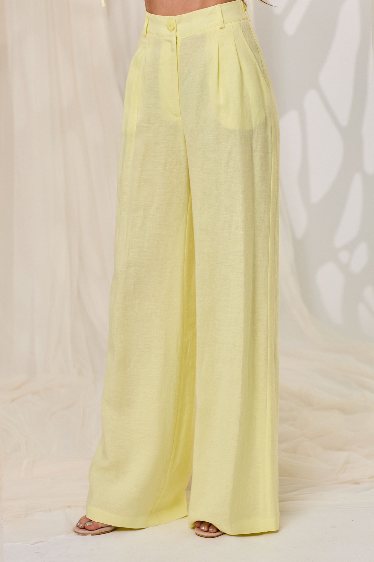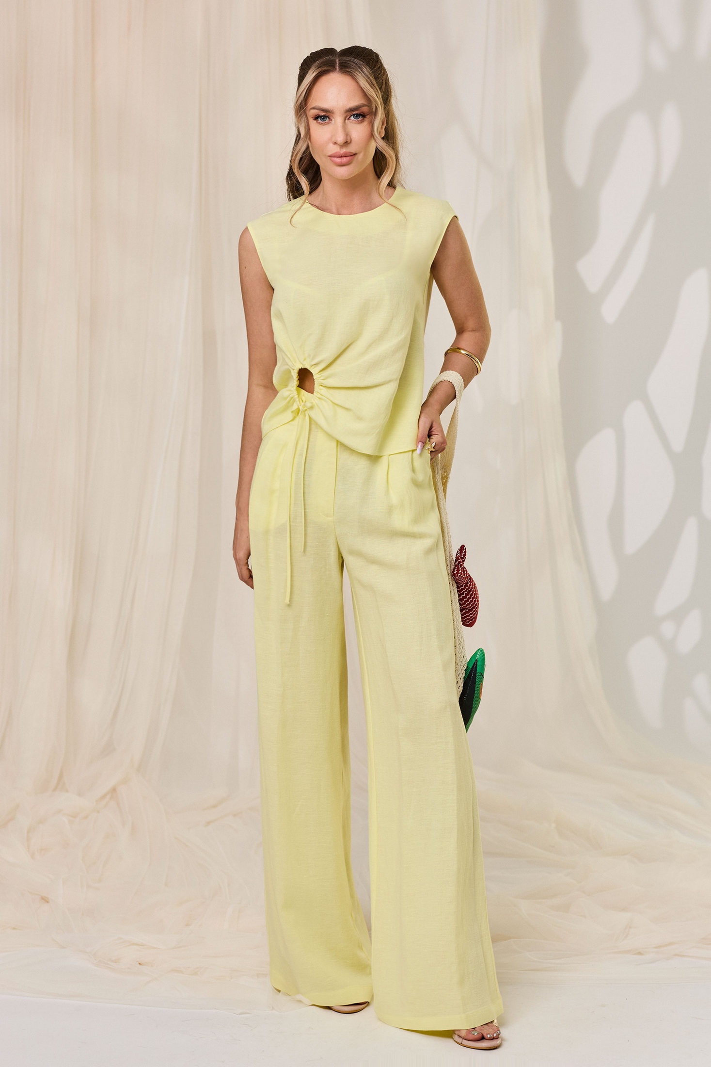 блузка с застежкой на навесную петлю и пуговицу по горловине спинки, без воротника, с круглым вырезом горловины. По переду с фигурным вырезом, присборенным шнуром с кулисой. Спинка со средним швом, разрезом по горловине. Блузка без рукавов. Брюки с отрезным поясом. Пояс в области спинки присборен на резинку. На передних половинках расположены карманы, вход в карман наклонный к боковому шву. Передние половинки с двумя односторонними складками.