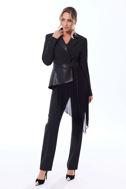 Жакет с центральной двубортной застежкой на пришивные кнопки, с втачным воротником и отложными лацканами. Отрезной по линии талии с втачным поясом. Баска с фигурной линией низа. Правая полочка зафиксирована поясом- завязкой с полукольцами. Левая полочка с отлетной деталью- гофре. Верхняя часть спинки со средним швом, рельефами, выходящими из проймы. Рукав втачной, длинный. Брюки с отрезным поясом, на поясе расположены шлевки. Застежка гульфик.
