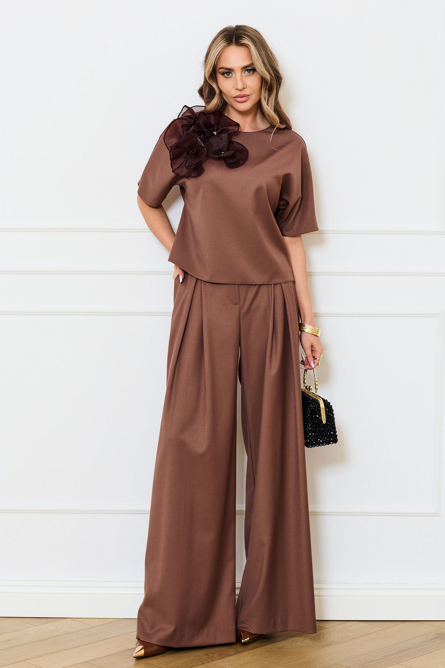 Костюм брючный 6745 коричневый Golden Valley — это стильный и удобный выбор для вашего гардероба. Коллекция бренда Golden Valley предлагает изысканное сочетание полиэстера, вискозы и спандекса, что обеспечивает комфорт и долгое ношение. Блузка выполнена без воротника, с круглым вырезом и застежкой на пуговицу. Декор в виде цветов из органзы и пришивных бусин придаёт особый шарм. Брюки расширенного силуэта с отрезным поясом и карманами по бокам добавляют функциональности. Этот ансамбль идеально подойдет для осенне-весеннего сезона, подчёркивая ваш повседневный и офисный стиль. Костюм выполнен в коричневом цвете, который отлично сочетается с разными аксессуарами.