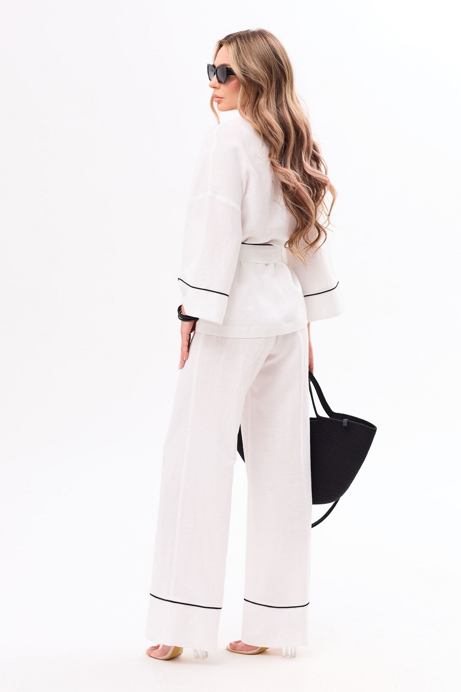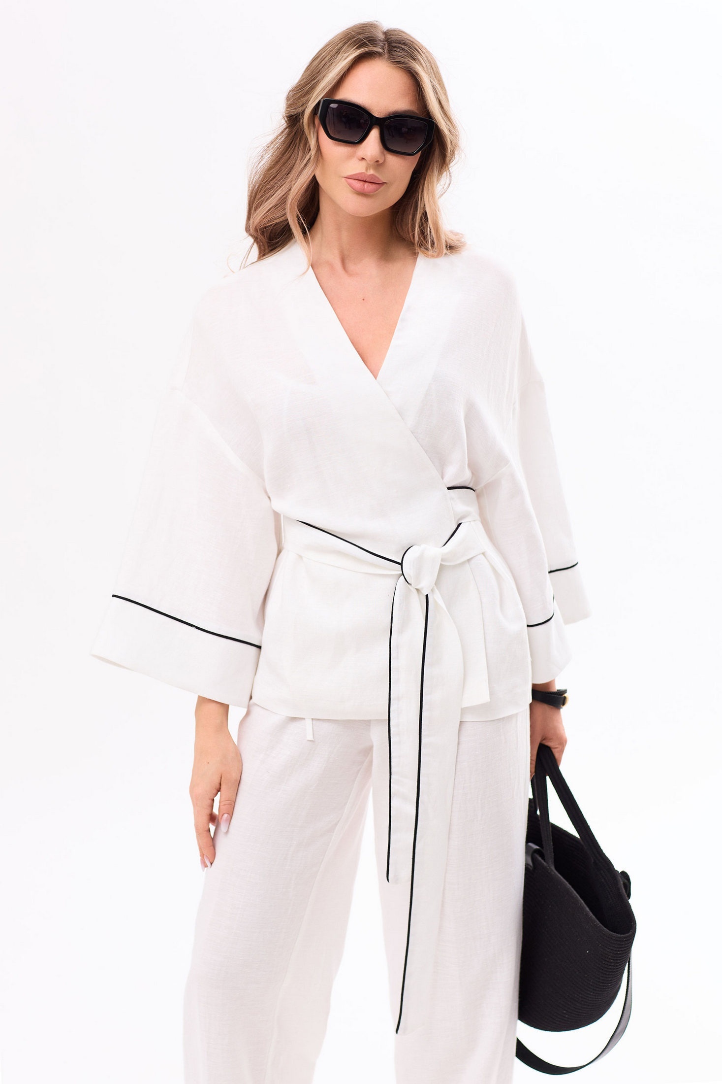 Костюм брючный 6764 белый Golden Valley — это идеальный выбор для стильного повседневного образа. Коллекция бренда Golden Valley предлагает костюм, выполненный из комбинации льна и вискозы, что обеспечивает комфорт и легкость. Прямой силуэт и контрастный кант придают образу элегантность. Блузка без воротника с V-образным вырезом украшена завязками и поясом на талии, а рукава ¾ с отрезной манжетой добавляют изюминку. Брюки с резинкой в поясе и манжетами по низу предлагаются вместе с классическим пиджаком. Комплект выполнен в молочном цвете, что делает его идеальным для тёплых сезонов и прогулок. Основные характеристики включают фиксацию на завязки, отрезные манжеты и комфортный крой.