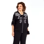 Жакет: свободного силуэта, со спущенным плечом, с центральной бортовой застежкой на петли и пуговицы. Перед ассиметричный, с отрезными кокетками. С левой стороны переда расположен накладной карман с отделочным клапаном. С правой стороны, в шве притачивания кокетки, расположена шлевка с полукольцом. Спинка без среднего шва. Горловина обработана воротником стойкой. Низ рукава обработан манжетой из отделочного материала. Жакет имеет притачной пояс с резинкой.