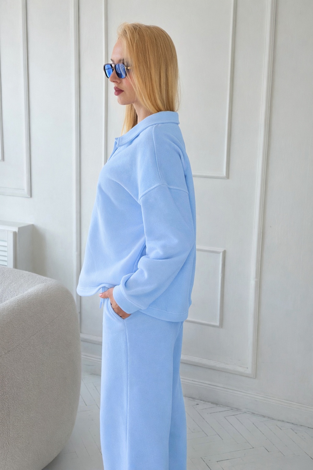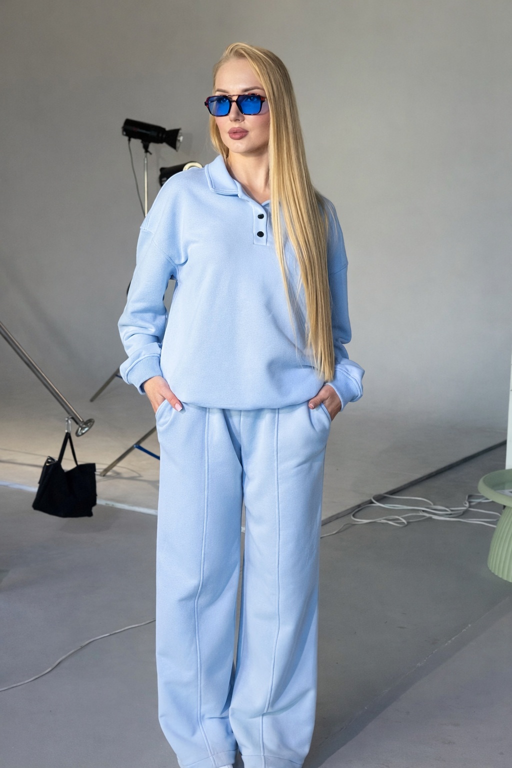 Костюм брючный 25ICY092Н голубой ICY Street. Коллекция бренда ICY Street предлагает современный трикотажный костюм с расслабленной архитектурой силуэта. Изготовленный из мягкого трикотажного полотна с 85% хлопка, он обеспечивает комфортное ношение и стабильность формы. Джемпер oversize со спущенной линией плеч и воротником стойка-отложной с планкой создаёт стильный образ. Брюки прямого кроя с цельнокроеным поясом обеспечивают чистый силуэт и комфорт благодаря резинке. Удобные карманы с отрезным бочком и регулируемая шнуром-жгутом посадка делают костюм идеальным выбором для повседневного и прогулочного гардероба. Подходит для весны и лета, выполнен в нежном голубом цвете.