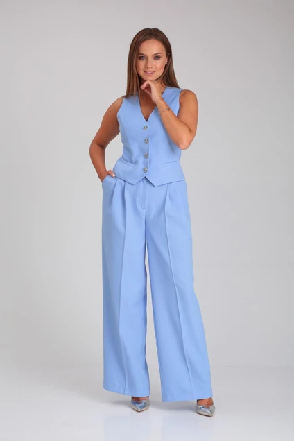 Комплект женский брючный,состоит из жилета и брюк.Брюки широкие со складками и стрелками,на поясе со шлевками,застежка на молнию и пуговицу,карманы по передним половинкам брюк.Жилет женский на подкладке,с центральной застежкой на четыре петель и пуговиц(размер и цвет фурнитуры может незначительно отличаться от фото)прилегающего силуэта.Перед жилетки с рельефными швами идущими от проймы до низа изделия.Карманы по переду прорезные в простую рамку с листочкой.Низ борта скошенный.Спинка жилета со средним швом и рельефными швами идущими от проймы до низа изделия.Горловина без воротника с V-образным вырезом.Брючный костюм подойдет для повседневной носки,а также для официальных мероприятий.Он сочетается с различными акскссуарами и обувью. Рост модели 170см.Длина жакета по спинке 49см,Длина брюк 113см.