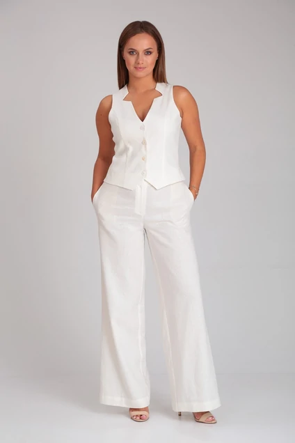 Брючный костюм из льна-это стильный и удобный выбор для жаркой погоды.Лен натуральный материал,который отлично впитывает влагу и обеспечивает хорошую циркуляцию воздуха.Это позволяет чувствовать себя комфортно в любой ситуации.Брюки из льна прямого кроя.По переду застежка на молнии и карманы в боковых швах.Жилет женский на подкладке,прилегающего силуэта.Карманы по переду прорезные в простую рамку с листочкой.По педеду застежка на четыре петли-пуговицы.Брючный костюм подойдет для повседневной носки,а также для официальных мероприятий Он сочетается с различными акскссуарами и обувью. Рост модели 170см.Длина жилета по спинке 49см,Длина брюк 112см.