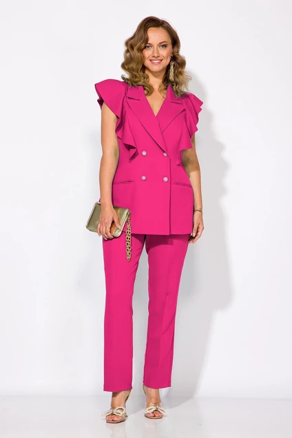 Эффектный нарядный костюм, состоящий из жакета на двубортной застежке и брюк. Жакет с английским отложным воротником, с подбортам. По полочке расположены продольные рельефы, переходящие в фальбон. Спинка приталенная, с продольными рельефами. Есть прорезные карманы в рамку. Жакет на подкладке!