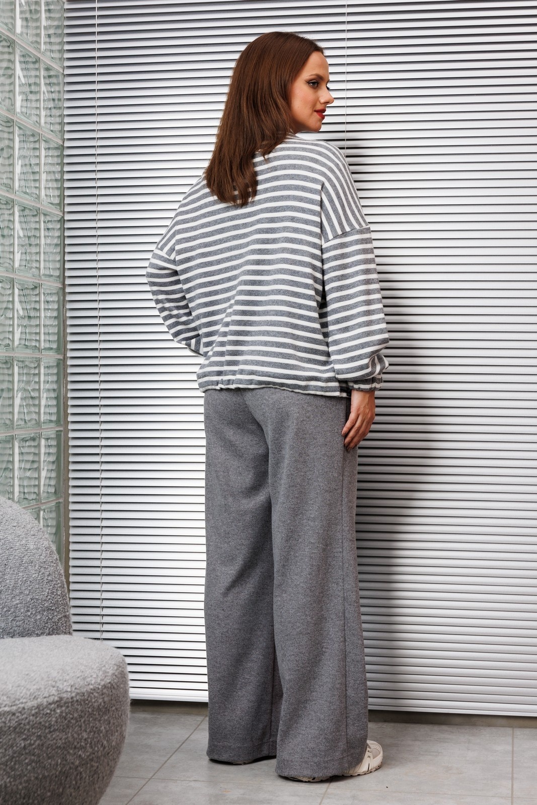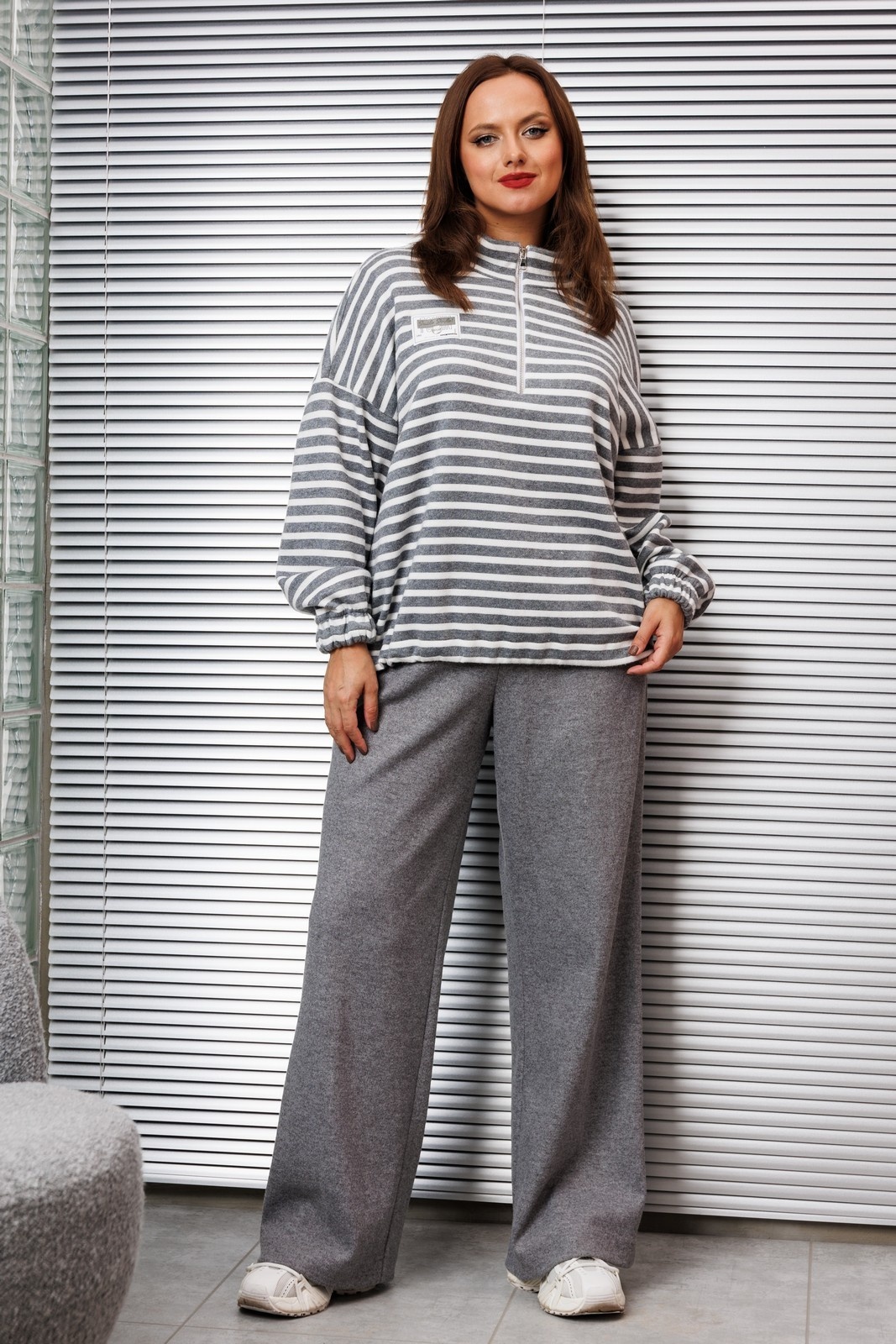 Комплект женский состоящий из джемпера и брюк. Джемпер свободного силуэта, вырез горловины со стойкой и застежкой на тесьму-молнию. Молния служит удобной застежкой, позволяя регулировать глубину выреза. Рукав спущенный, длинный. Декором являются нашивка на груди.