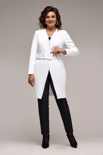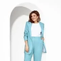 Костюм, состоящий из удлиненного жакета, брюк и топа на регулируемых бретелях. Брюки классические, по поясу вставлена резинка для лучшего прилегания. Жакет удлиненный с карманами в боковых швах. В комплекте идет пояс.
