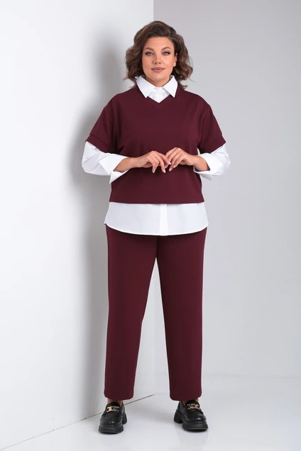 Компект женский 3-х предметный, брюки, жилет и рубашка. Жилет выполнен из трикотажа под "мех" свободного силуэта. Горловина с V-образным вырезом. Рукав спущен, на притачной монжете по низу. По боковым швам выполнены разрезы. Рубашка прямая , воротник отложной на стойке. Застежка на планку с петлями -пуговицами. По переду выполнена нагрудная вытачка. Брюки прямые на трикатажном поясе, со сборкой на резинку. По переду брюк выполена имитация гульфика. Так же по переду выполнен корман.