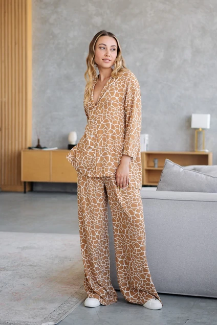 Этот костюм-пижама идеально подходит как для комфортного отдыха дома, так и для активного движения в городской суете. Он выполнен из мягкой и приятной на ощупь ткани, которая обеспечивает комфорт и уют. Блузка имеет прямой крой и немного удлиненную спинку, что создает дополнительный комфорт и элегантность. Она застегивается на пуговицы и имеет отложной воротничок с лацканами, что придает ей изысканный и стильный вид. Боковые разрезы на блузке добавляют легкости и воздушности образу. Брюки свободного кроя и широкие, что обеспечивает полную свободу движений. Пояс полностью эластичный и регулируется по размеру, что позволяет идеально подогнать костюм под фигуру. Карманы с отрезным бочком добавляют функциональности и удобства. В комплекте с костюмом идет пояс, который можно использовать для дополнительной фиксации блузки. Этот костюм-пижама станет незаменимым элементом вашего гардероба и подарит вам комфорт и уют на протяжении всего дня.