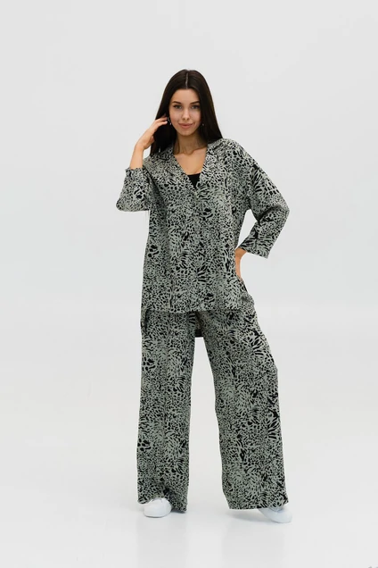 Костюмы-пижама - это тренд теплого сезона в этом году. Костюм женский брючный, покрой свободный, умеренный оверсайз. Жакет прямого свободного кроя, спинка длиннее переда, рукава укороченные, примерно длиной 7/8, застегивается на пуговицы, в дополнение идет пояс, которым можно подчеркнуть талию. Брюки на резинке, прямые, свободные, с легкостью сядут на любой тип фигуры. Наш нарядный женский костюм-пижама - выгодное приобретение для тех, кто любит комфортную, удобную одежду. Повседневный женский брючный костюм будет отличным вариантом как для будней, так и для различного рода мероприятий. Красиво сочетается с любой обувью по сезону.