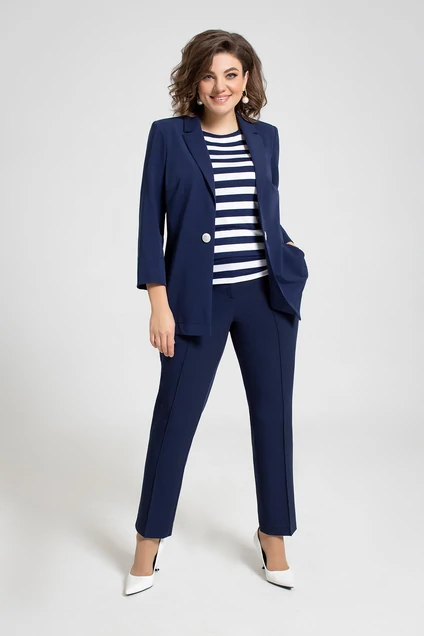 Данный образ может олицетворять как сдержанную элегантность, так и игривое настроение. Комплект трехпредметный, состоящий из жакета, блузки и брюк. Жакет полуприлегающего силуэта, длиной ниже линии бедер, без застежки. Спинка с талиевыми вытачками и средним швом, в котором обработана шлица. Перед с талиевой вытачкой и рельефом. В рельефе обработан карман. Воротник пиджачного типа с лацканом. Рукава двушовные, втачные, длиной 3/4. По переду пришиты декоративные пуговицы. Жакет без подкладки. Блузка полуприлегающего силуэта, из трикотажной вискозы, длиной до линии бедер. Горловина округлой формы, обработана притачной бейкой. Рукава одношовные, втачные, короткие. Брюки полуприлегающего силуэта, длиной ниже щиколотки. Брюки на притачном поясе, с частично вставленной резинкой (по спинке). По передним половинам обработан защип и боковые карманы с наклонным входом. В среднем шве переда обработана застежка с гульфиком и откоском на тесьму-«молнию». По поясу застежка на петлю и пуговицу. Посадка брюк чуть ниже линии талии.