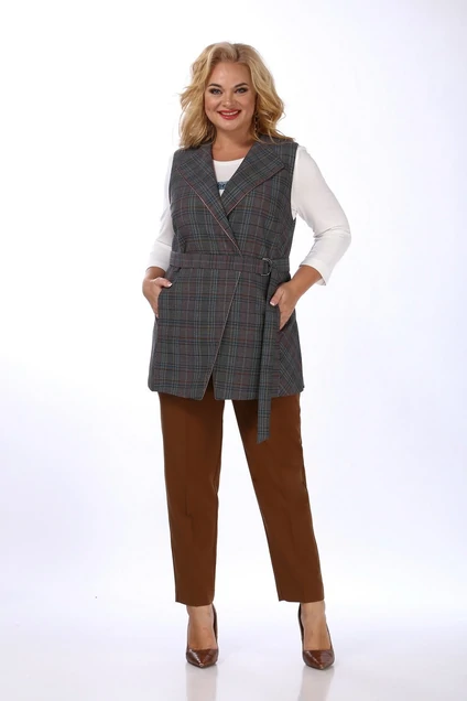 Комплект брючный 3-х предметный состоит из жилета, брюк и джемпера. Жилет изготовлен из костюмной ткани в клетку. Застежка двубортная на петлю и пуговицы. Вырез горловины V-образный формы с отложными лацканами. Перед жилета с нагрудными вытачками и боковыми деталями, в которых обработаны карманы в шве. Спинка разрезная со средним швом и кокеткой. В боковых швах обработаны разрезы. Жилет дополнен кантом по лацканам и кокетке. Изделие на подкладке. Брюки из однотонной костюмной ткани, средней посадки, заужены к низу. Пояс брюк обтачной, застежка на молнию и пуговицу. По передним деталям брюк обработаны боковые карманы, по задним деталям настрочены клапаны. Джемпер изготовлен из вискозного полотна. Горловина круглой формы, рукав втачной длиной 3/4. Джемпер дополнен печатью.