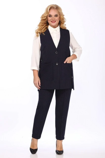 Комплект брючный 3-х предметный изготовлен из костюмной ткани, состоит из жилета, брюк и блузки. Жилет полуприлегающего силуэта с центральной линией борта и застежкой на петли и пуговицы. Горловина V-образной формы. На переде имеются декоративные отлетные шлицы с пуговицами и накладные карманами. Спинка со средним швом и кокеткой. Жилет на подкладке и с ассиметричным низом. Блузка прямого силуэта. Горловина с рубашечным воротником, рукав втачной длиной 3/4. Застежка на петли и пуговицы. Брюки средней посадки. Пояс притачной с застежкой на петлю и пуговицу, имеется резинка. В передних деталях обработаны косые карманы в швах. Низ брюк с манжетами.