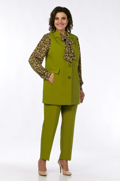 Комплект брючный 3-х предметный состоит из жилетки, брюк и блузы. Жилетка изготовлена из однотонной костюмной ткани прямого силуэта. Воротник пиджачного типа, застежка центрально-бортовая на две петли и пуговицы. По переду обработаны рельефы от нагрудных вытачек, в которых расположены карманы и настрочены клапаны. Спинка со средним швом и шлицей. Жилетка на подкладке. Имеется пояс из отделочной ткани. Брюки средней посадки, пояс частичной на резинке, застежка на молнию и две пуговицы. По передним деталям брюк обработаны боковые карманы с подрезным бочком. Блузка изготовлена из блузочной ткани с принтом. Воротник стойка, переходящая в бант. По переду кокетки со складками. По спинке встречная складка. Рукав втачной на манжете.