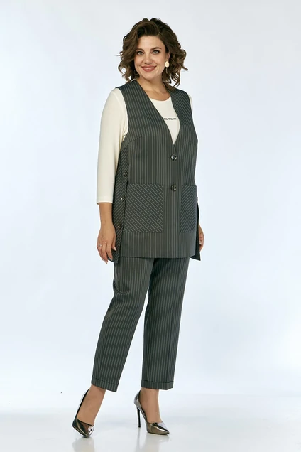 Костюм брючный 3-х предметный, выполнен из костюмной ткани в полоску, состоит из жилетки, джемпера и брюк. Жилет прямого силуэта, с V-образным вырезом, застежка центрально-бортовая на две петли и пуговицы. По переду имеются накладные карманы. По боковым декоративные шлицы смещенные к переду спинки с отложной складкой. Низ жилета с перепадом длинны. Изделие на подкладке. Джемпер выполнен из вискозного полотна прямого силуэта. Рукава втачные. Изделие дополнено печатью. Брюки классической посадки. Пояс притачной, по боковым вставки с эластичной тесьмой. В передних деталях брюк обработаны карманы с отрезным бочком. По низу брюк отвороты.
