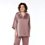 Комплект женский брючный 3-х предметный, состоит из жилета, блузки и брюк. Жилет свободного кроя из замшевой ткани. По переду планка, застежка на петли и пуговицы. На спинке средний шов. В боковых швах разрезы внизу. Блузка свободного кроя, выполнена из х/б ткани. Воротник рубашечного типа, застежка центральная на петли и пуговицы. Рукава спущенные на манжетах с застежкой на петли и пуговицы. Брюки классические из костюмной ткани. Пояс частично на резинке. Застежка на молнию и петлю-пуговицу. В брюках обработаны карманы.
