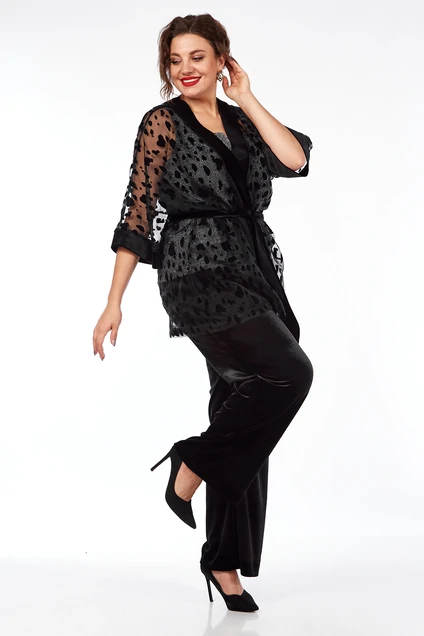 Комплект женский, брючный 3х — предметный , состоит из: топа, накидки и брюк. Накидка выполнена из органзы с флокам, отделкой служат планки, манжеты и пояс из велюра. Накидка свободного кроя с цельнокроеным рукавом, длиной 3/4 . Брюки изготовлены из велюра, прямые. Пояс брюк на резинке, обработаны боковые карманы. Топ из трикотажного полотна с блеском, форма горловины — каре.