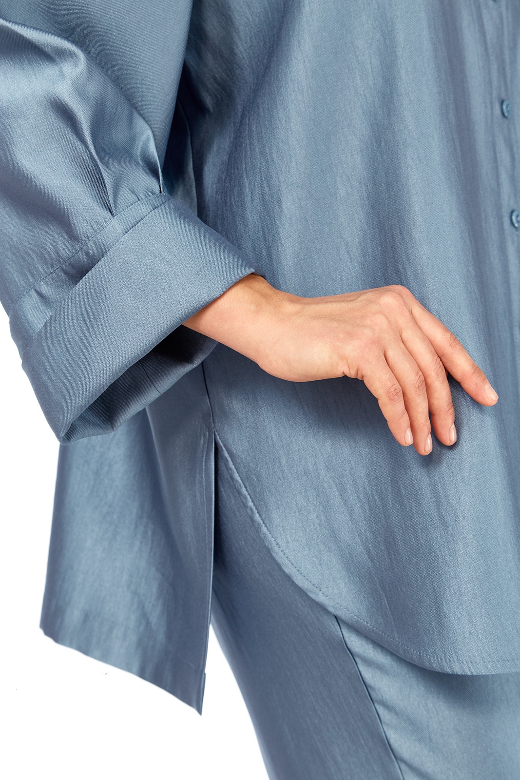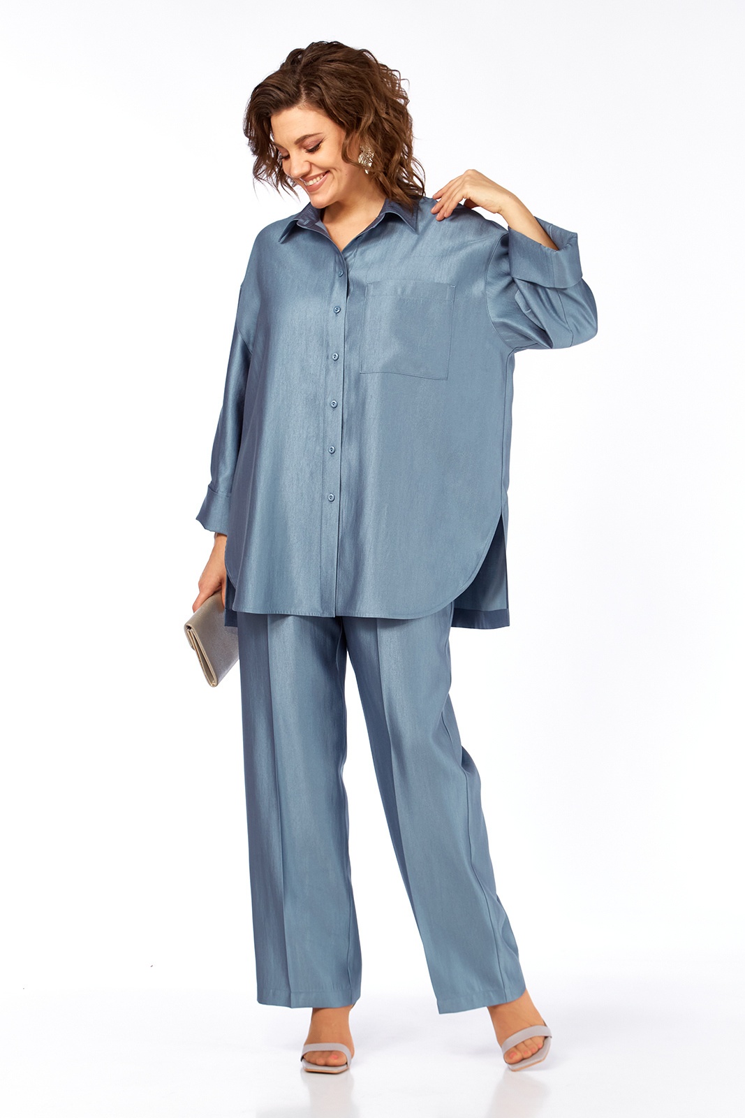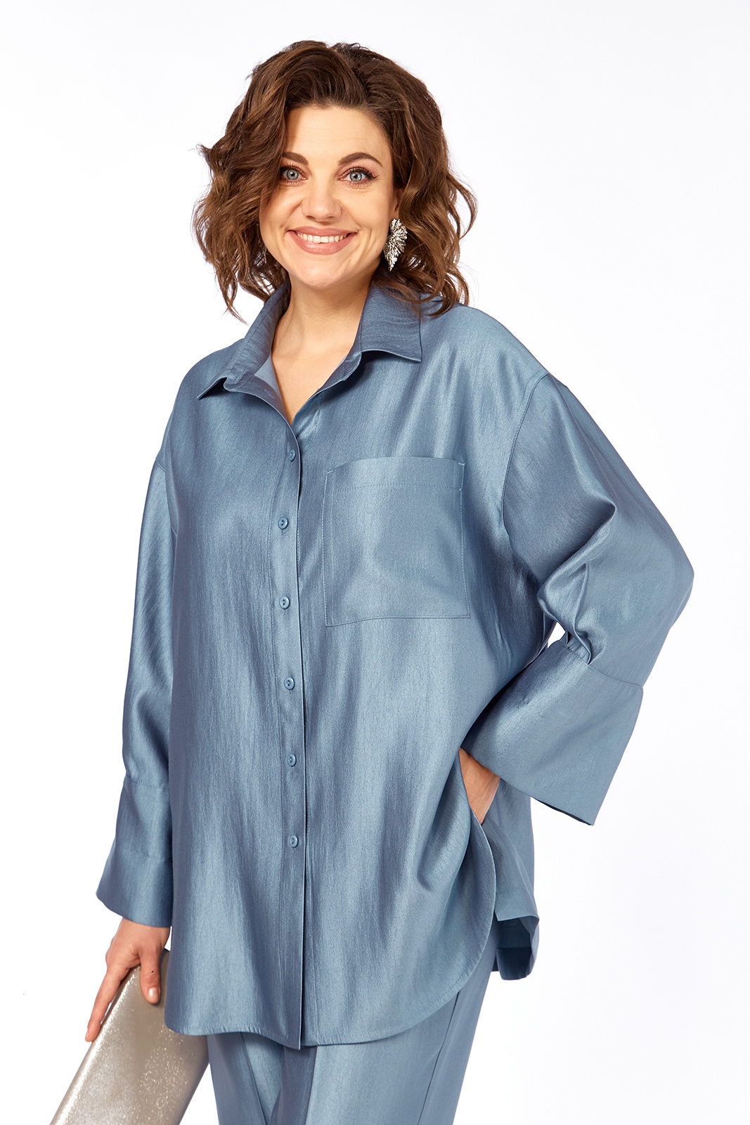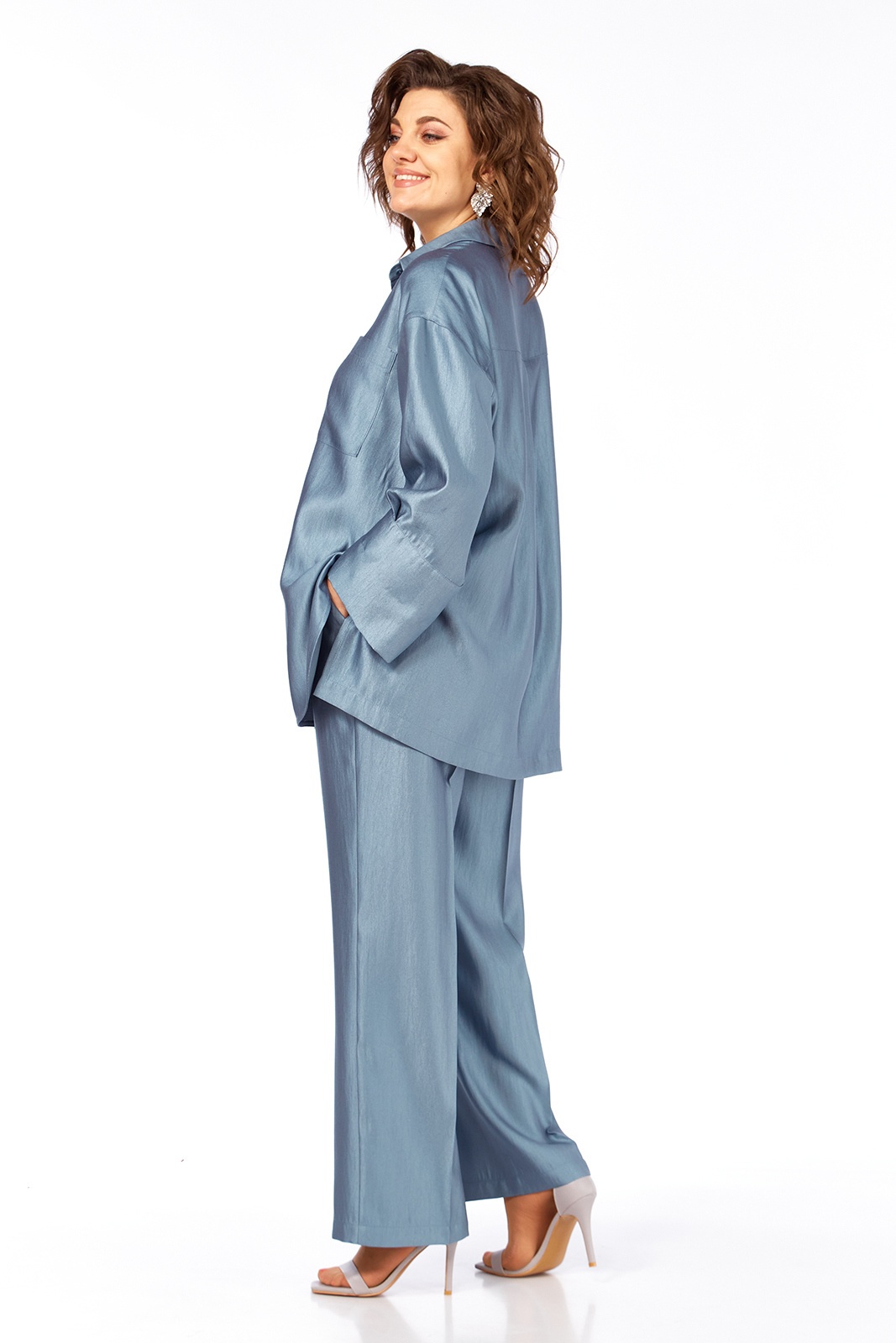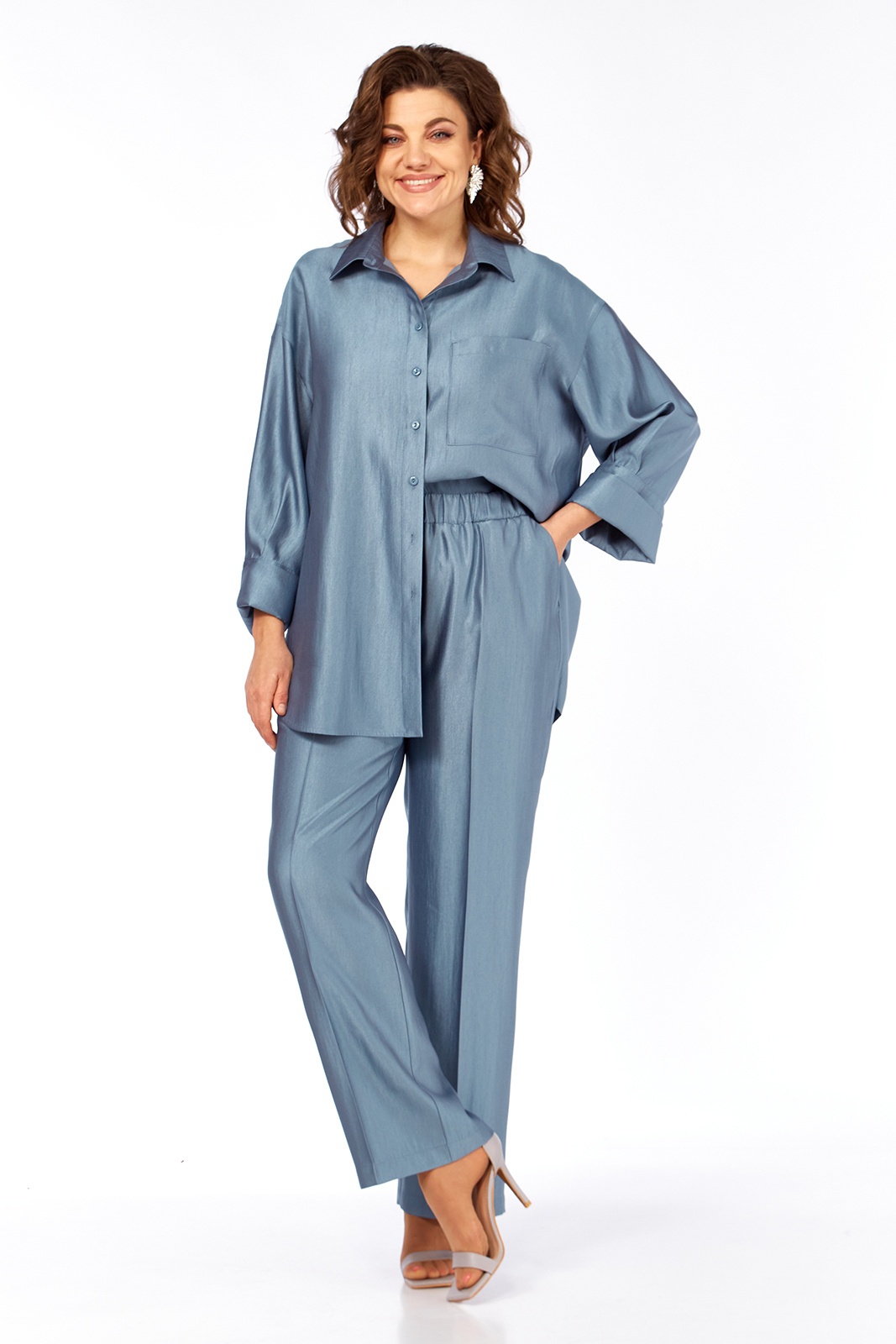 Костюм брючный двухпредметный, повседневно-нарядный, выполнен из ткани с мерцающим эффектом. Состоит из блузы и брюк. Блуза свободного силуэта. Воротник рубашечного типа, застежка центральная на петли и пуговицы. С левой стороны настрочной карман. Спинка с притачной кокеткой и встречной складкой. Рукава спущенные, по низу складки и широкая притачная манжета. Низ блузы фигурный. Брюки прямые, пояс притачной на резинке. В брюках обработаны карманы.