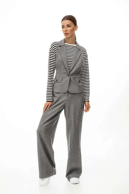 Костюм женский, состоящий из жилета и брюк. Жилет однобортный, на подкладке, отрезной по линии талии, с баской. Застежка на пуговицу. По переду расположены декоративные клапаны с пуговицей. Спинка с имитацией подтяжек на клевантах. Брюки прямого кроя. По переду расположены карманы в боковых швах. Пояс притачной с резинкой по спинке, застежка на пуговицу и молнию. Длина жилета: 44 р. - 56см.; 50р. - 57,5 см. Длина брюк: 44 р. - 107 см, 50 р. - 108 см.