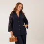 Костюм состоит из жакета с брюками. Жакет однобортный без подкладки, прямого силуэта с цельнокроеными рукавами. На полочках жакета обработаны наклонные прирезные карманы «в рамку» с листочкой. Кокетка полочки переходящая в кокетку спинки и верхнюю часть рукава из набивного гипюра в цвет основной ткани жакета. Манжета рукава так же из набивного гипюра. Спинка жакета прямая. Застежка на декоративные петли пуговицы. Горловина обработана втачным воротником с отрезной стойкой и лацканами. Брюки прямого силуэта от бедра с карманами в боковом шве. На передних половинках брюк заложены по 1 складке. По спинке брюк обработаны вытачки. Подгибка низа широкая. Застежка брюк на «молнию» в гульфике. Пояс брюк отрезной с частичной резинкой по спинке брюк.Цвет материала может отличаться по тону в зависимости от настроек вашего монитора!Длина жакета по спинке 46р. - 69,5 см, 52р. - 70 см, Длина брюк по боковому шву 111 см.