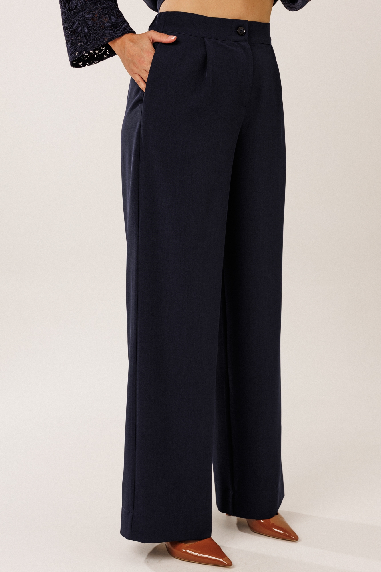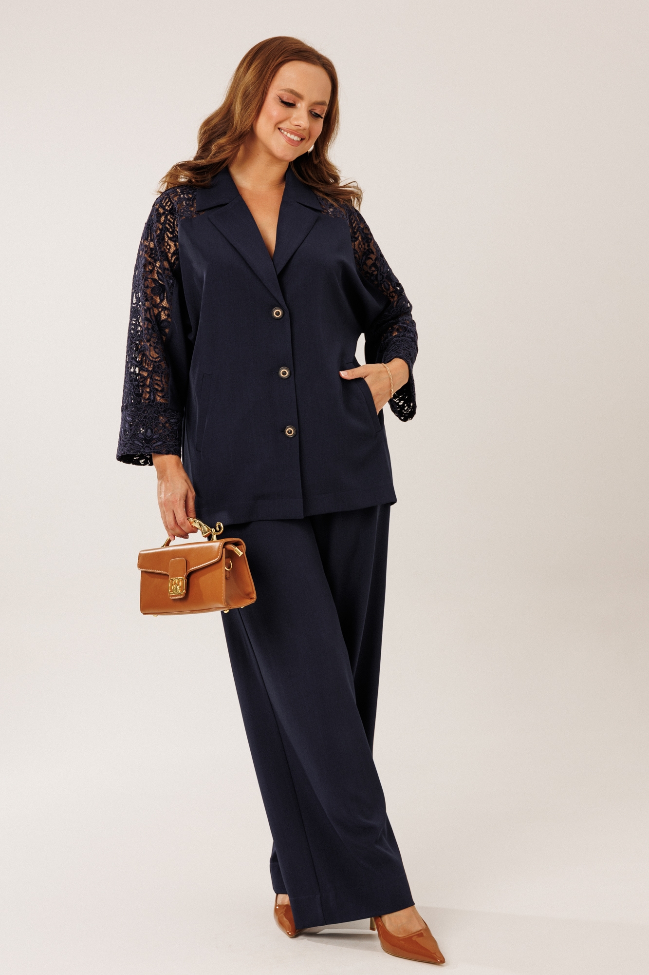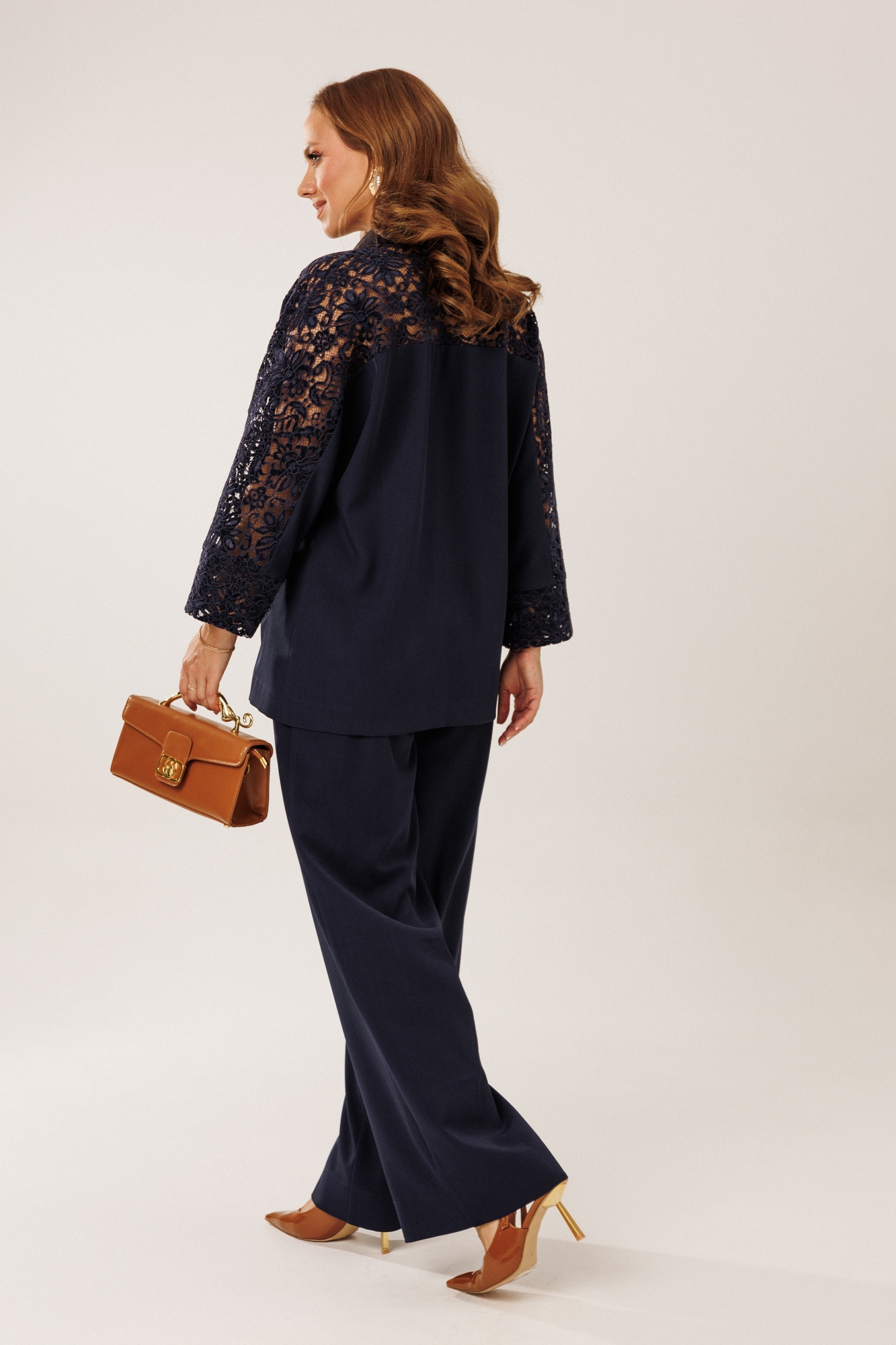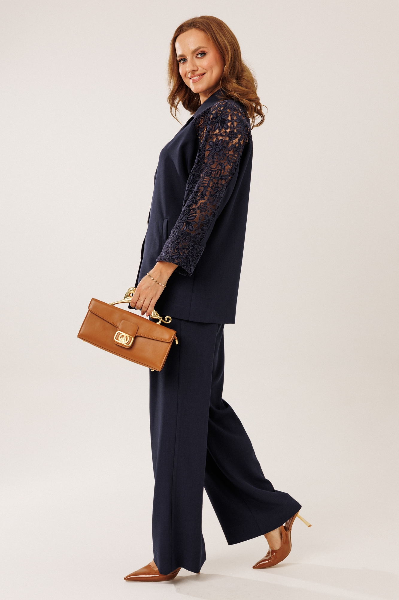 Костюм состоит из жакета с брюками. Жакет однобортный без подкладки, прямого силуэта с цельнокроеными рукавами. На полочках жакета обработаны наклонные прирезные карманы «в рамку» с листочкой. Кокетка полочки переходящая в кокетку спинки и верхнюю часть рукава из набивного гипюра в цвет основной ткани жакета. Манжета рукава так же из набивного гипюра. Спинка жакета прямая. Застежка на декоративные петли пуговицы. Горловина обработана втачным воротником с отрезной стойкой и лацканами. Брюки прямого силуэта от бедра с карманами в боковом шве. На передних половинках брюк заложены по 1 складке. По спинке брюк обработаны вытачки. Подгибка низа широкая. Застежка брюк на «молнию» в гульфике. Пояс брюк отрезной с частичной резинкой по спинке брюк.Цвет материала может отличаться по тону в зависимости от настроек вашего монитора!Длина жакета по спинке 46р. - 69,5 см, 52р. - 70 см, Длина брюк по боковому шву 111 см.