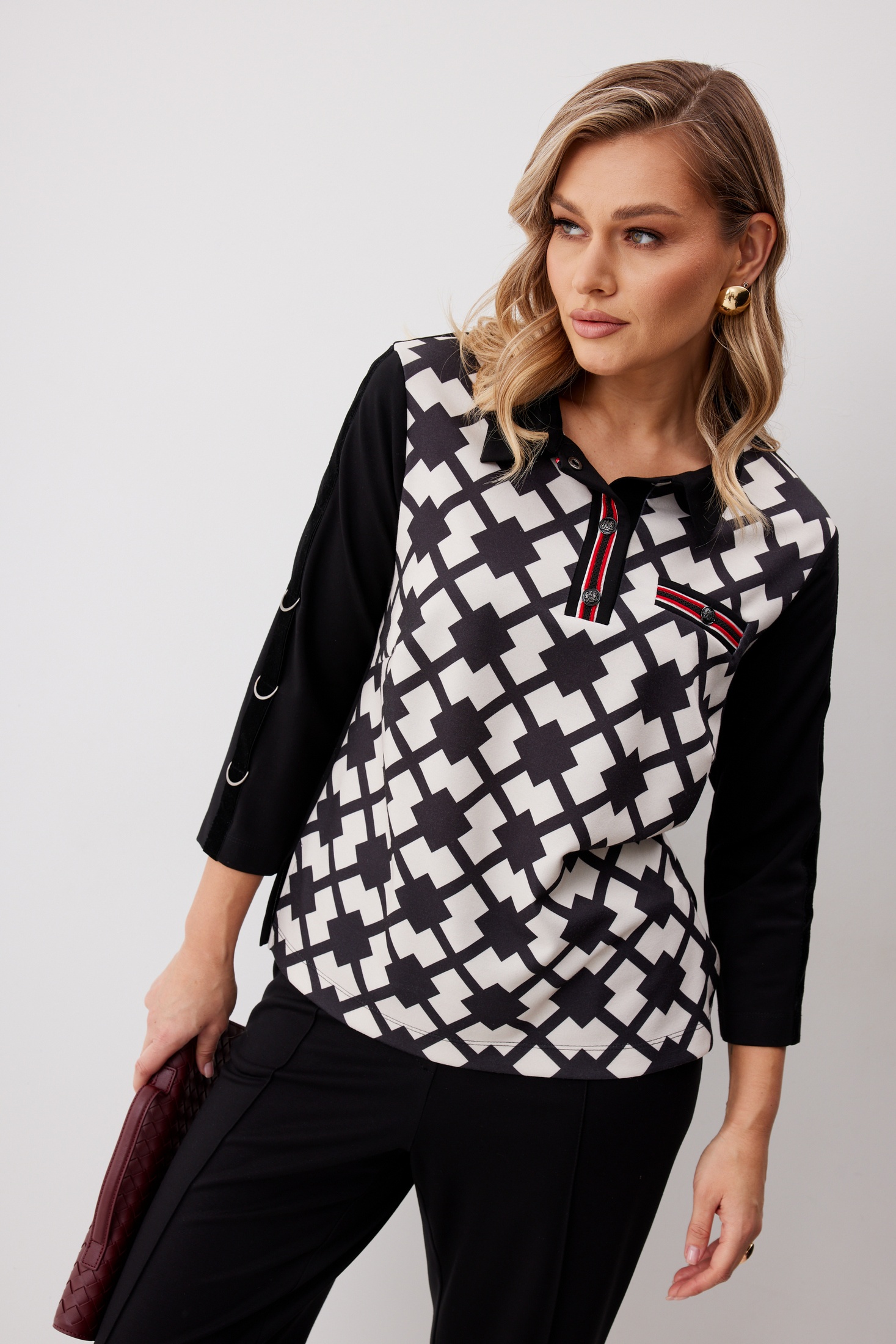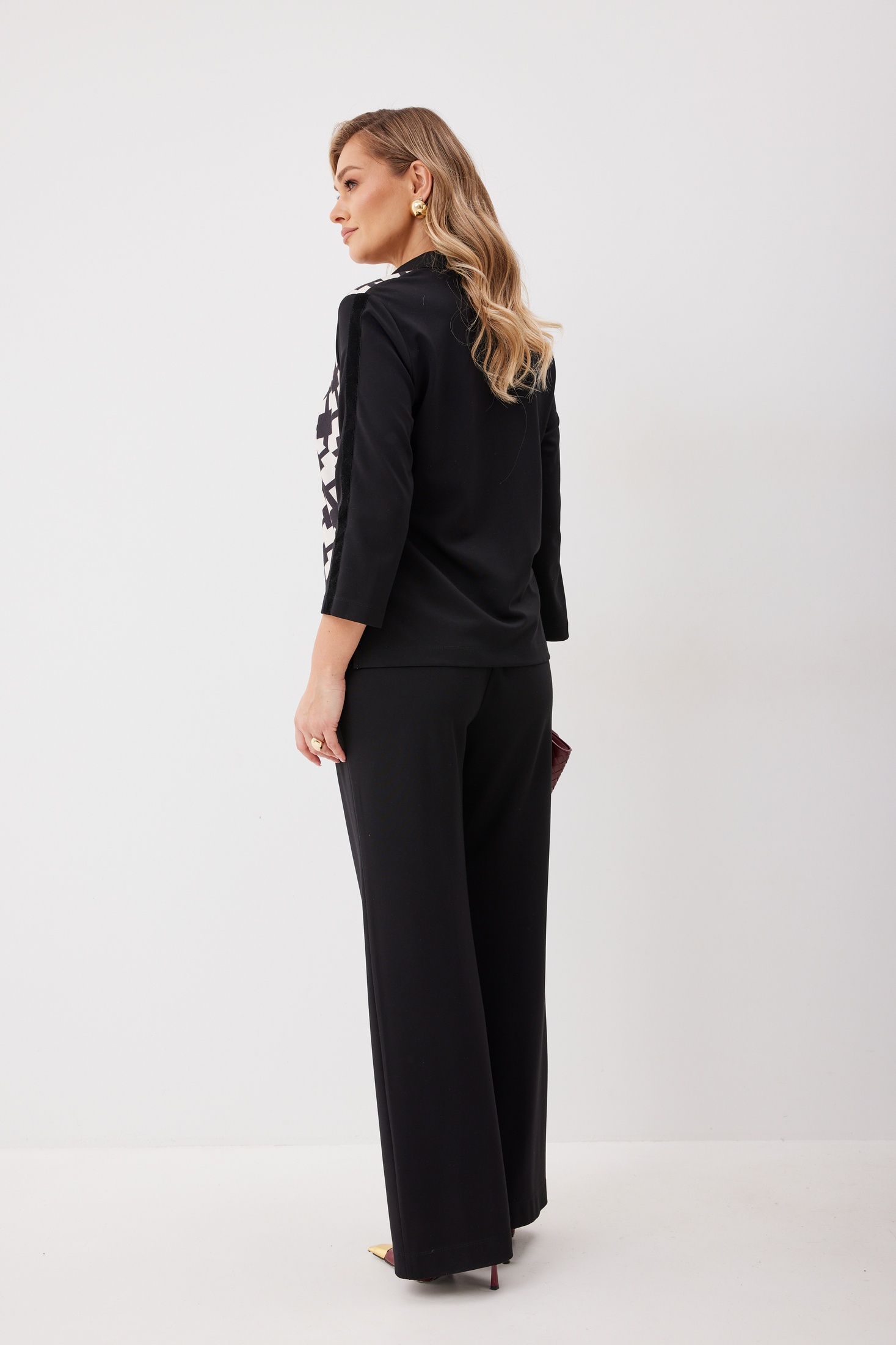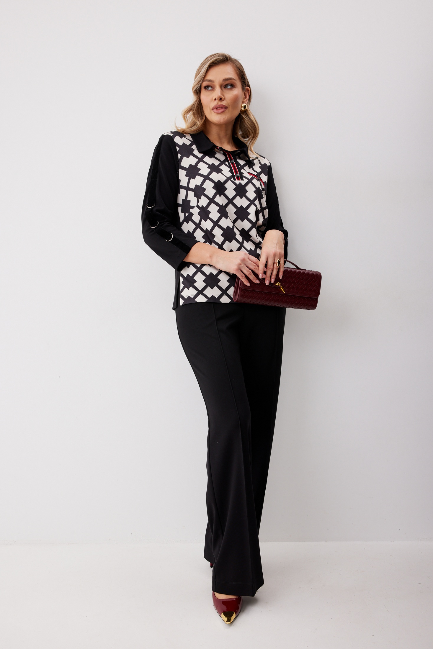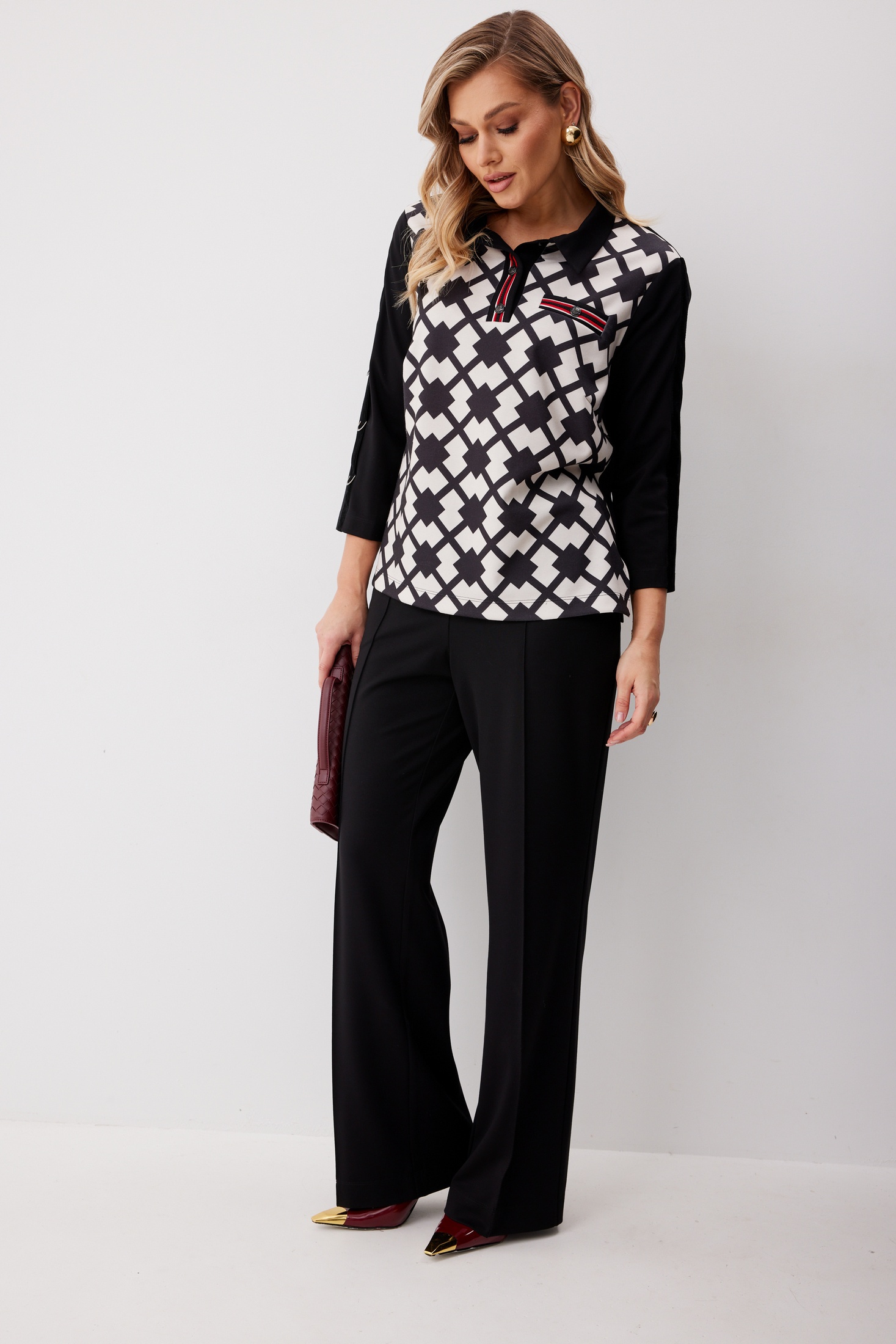 Костюм состоящий из блузы с брюками. Блуза по типу «поло» из трикотажной ткани длиной до середины бедра с застежкой до линии груди. Втачные планки обработаны декоративной тесьмой и застегиваются на кнопки. Перед выполнен из ткани с принтом. По левой половинке выполнен карман обманка с листочкой с декоративной тесьмой и кнопкой. Спинка прямая. Горловина обработана втачным воротником. Рукав ¾ прямой одношовный. На рукавах настрочена декоративная бархатная лента, на правом рукаве с тремя полукольцами. Брюки прямого силуэта из трикотажной ткани с поясом на частичной резинке. По передним половинкам брюк застрочены стрелки и выполнены наклонные карманы с отрезным бочком. Верх кармана декорирован бархатной тесьмой. По передним половинкам отстрочен гульфик (имитация). По спинке брюк застрочены вытачки.Длина спинки изделия 63,5 см, длина руква 50 см, длина брюк по боковому шву с поясом 115 см.