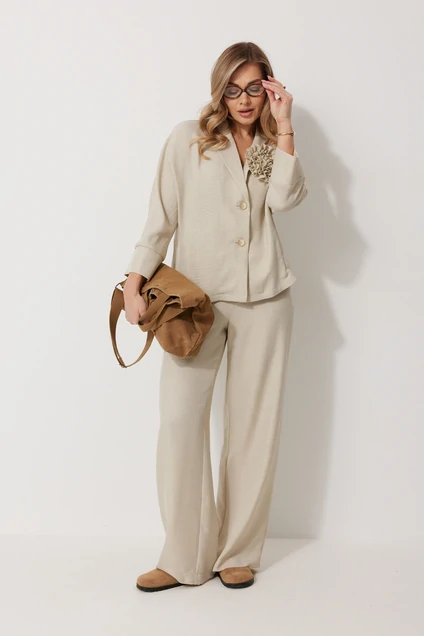 Костюм брючный 2287 Kaloris предлагает идеальное сочетание модного дизайна и удобства. Коллекция бренда Kaloris выполнена из сочетания полиэстера, вискозы и спандекса, что обеспечивает комфорт и лёгкость в движении. Фасон жакета с кроем "летучая мышь" и рукавами 7/8 придаёт образу свежесть и уникальность. V-образная горловина и воротник пиджачного типа делают костюм подходящим для офиса или деловых встреч, в то время как декор в виде авторской броши добавляет изюминку. Брючный костюм выполнен в нейтральном бежевом цвете, что позволяет легко сочетать его с другими элементами гардероба. Сезонный вариант костюма идеально подходит для весенне-осеннего периода благодаря своим утонченным габаритам и характеристикам ткани. Длина спинки жакета составляет 58 см, рукава - 66 см, а брюки имеют длину по боковому шву 109 см.