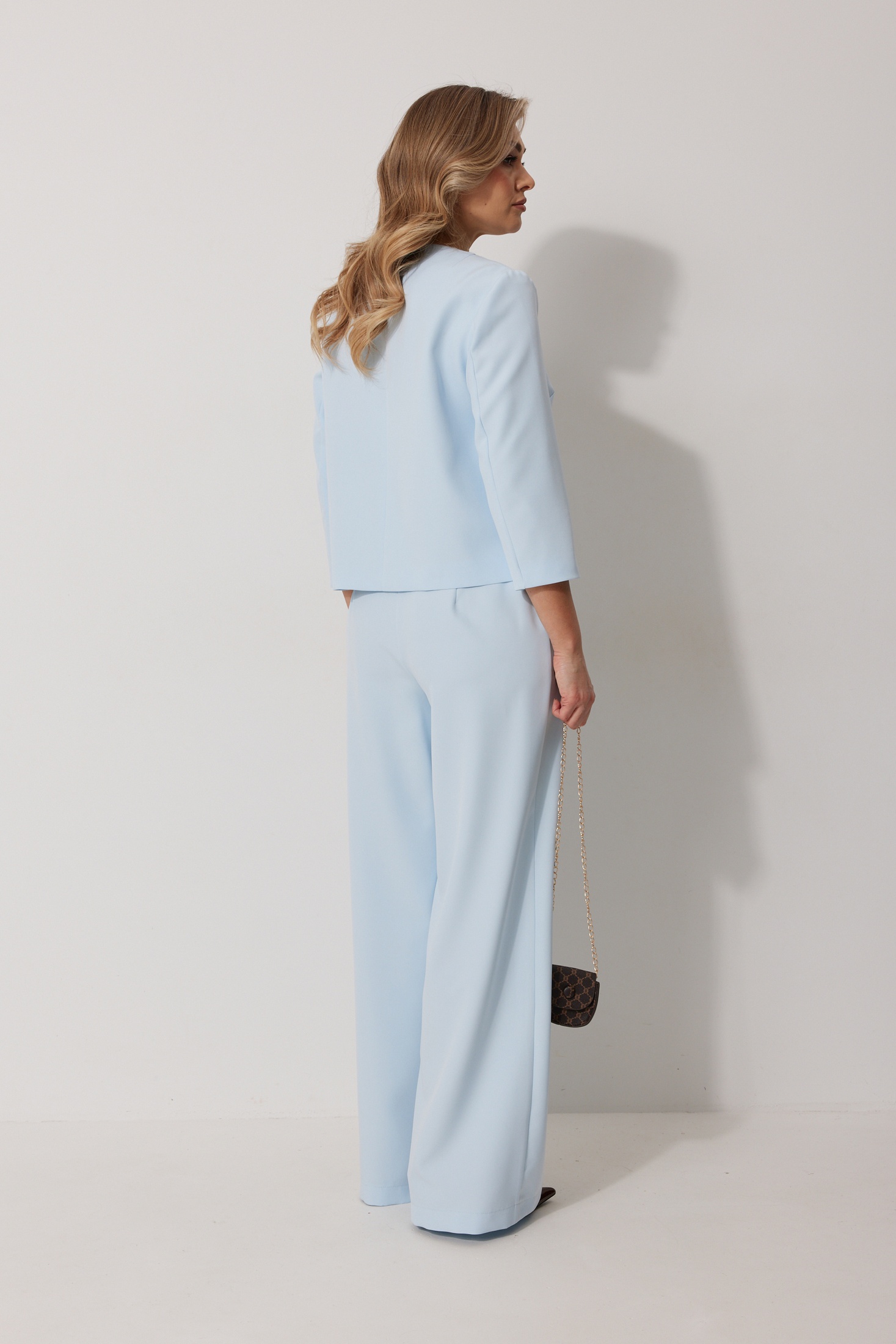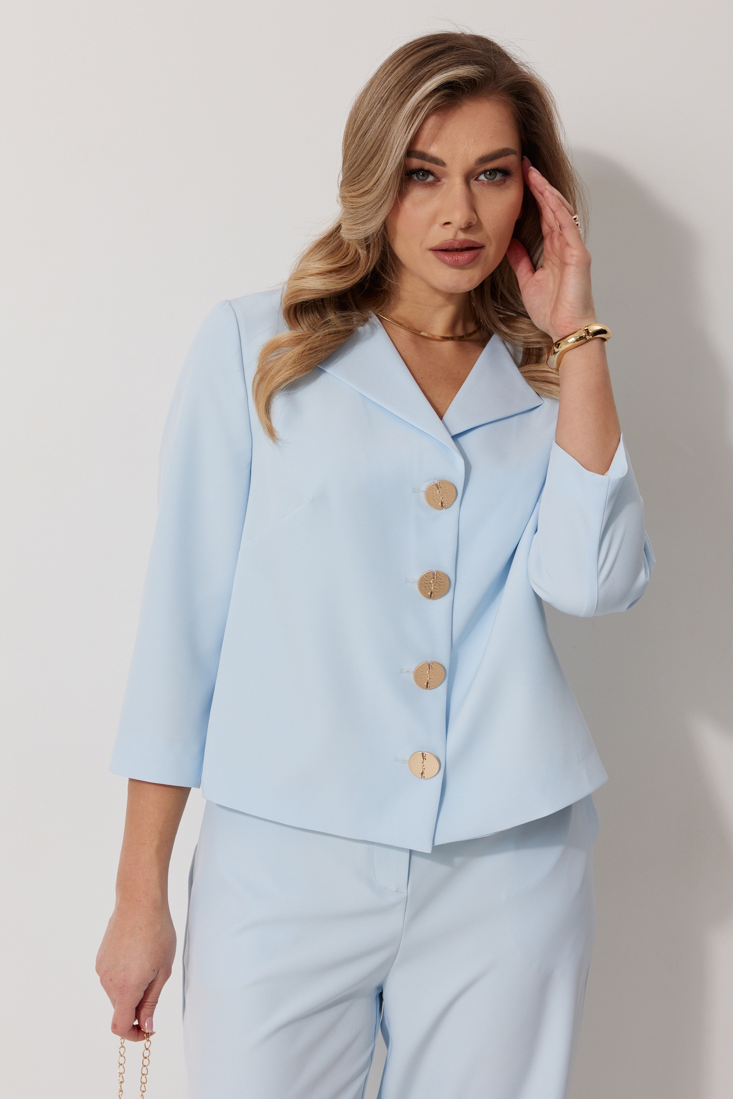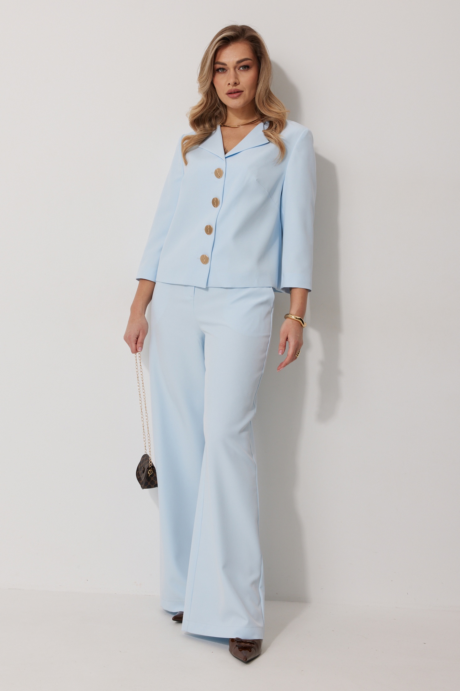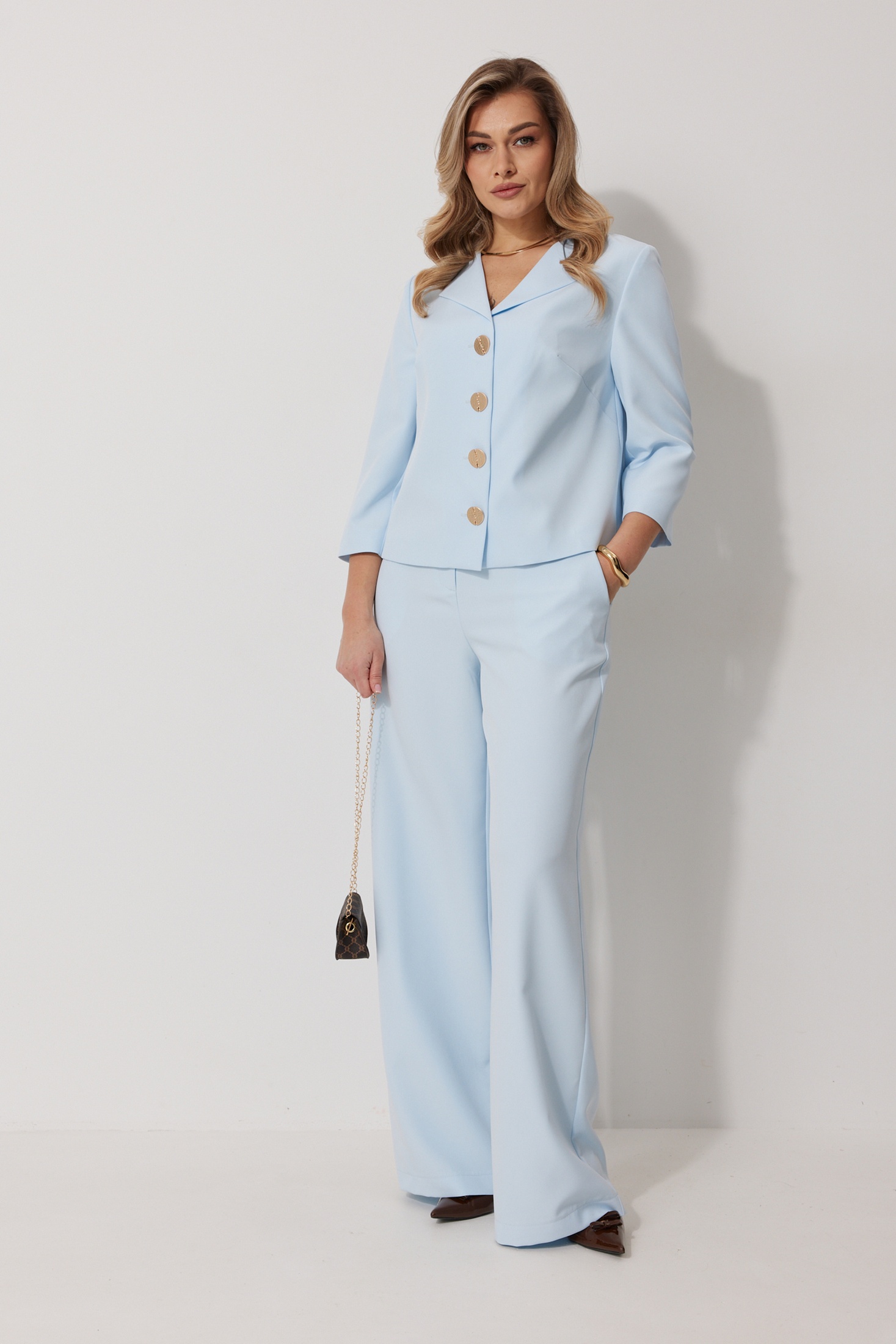 Костюм брючный 2288 Kaloris представляет собой идеальное сочетание стиля и комфорта для современной женщины. Коллекция бренда Kaloris делает акцент на элегантности и функциональности. Изготовленный из мягкого материала с содержанием вискозы и спандекса, костюм прекрасно подчеркивает фигуру и обеспечивает свободу движений. Жакет на подкладке с V-образным вырезом и отворачивающимися лацканами, дополненный декорированными пуговицами, создает стильный образ. Рукава длиной три четверти подходят для межсезонья, а прямые брючные ножки со стильными карманами завершают общий вид. Небесно-голубой оттенок делает комплект универсальным для офиса и легких прогулок. Длина жакета – 56 см, что идеально подходит для линий бедра, а брюк – 109 см по боковому шву.